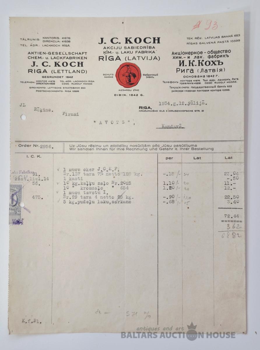 Rēķins. A/S "J. C. Koch" ķim.-un laku fabrika, 1934g.