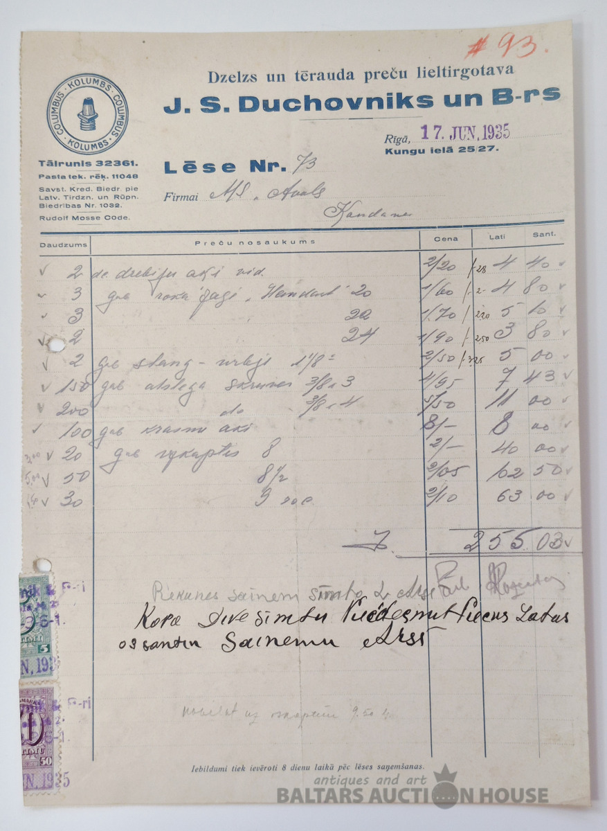 Lēse. Dzelzs un tērauda preču lieltirgotava J. S. Duchovniks un B-rs, 1935g.