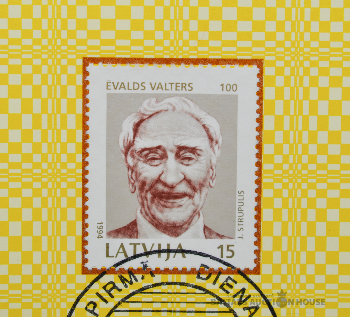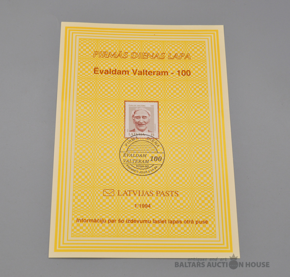 Pirmās dienas lapa ar marku. "Ēvaldam Valteram-100".