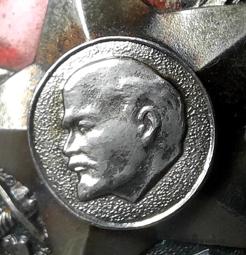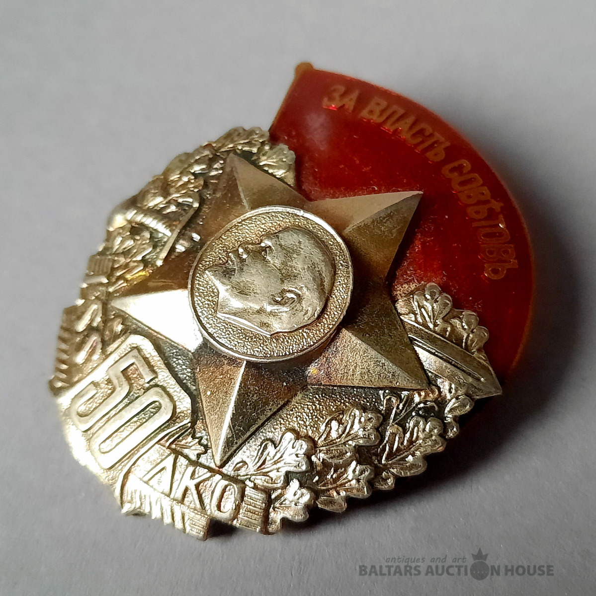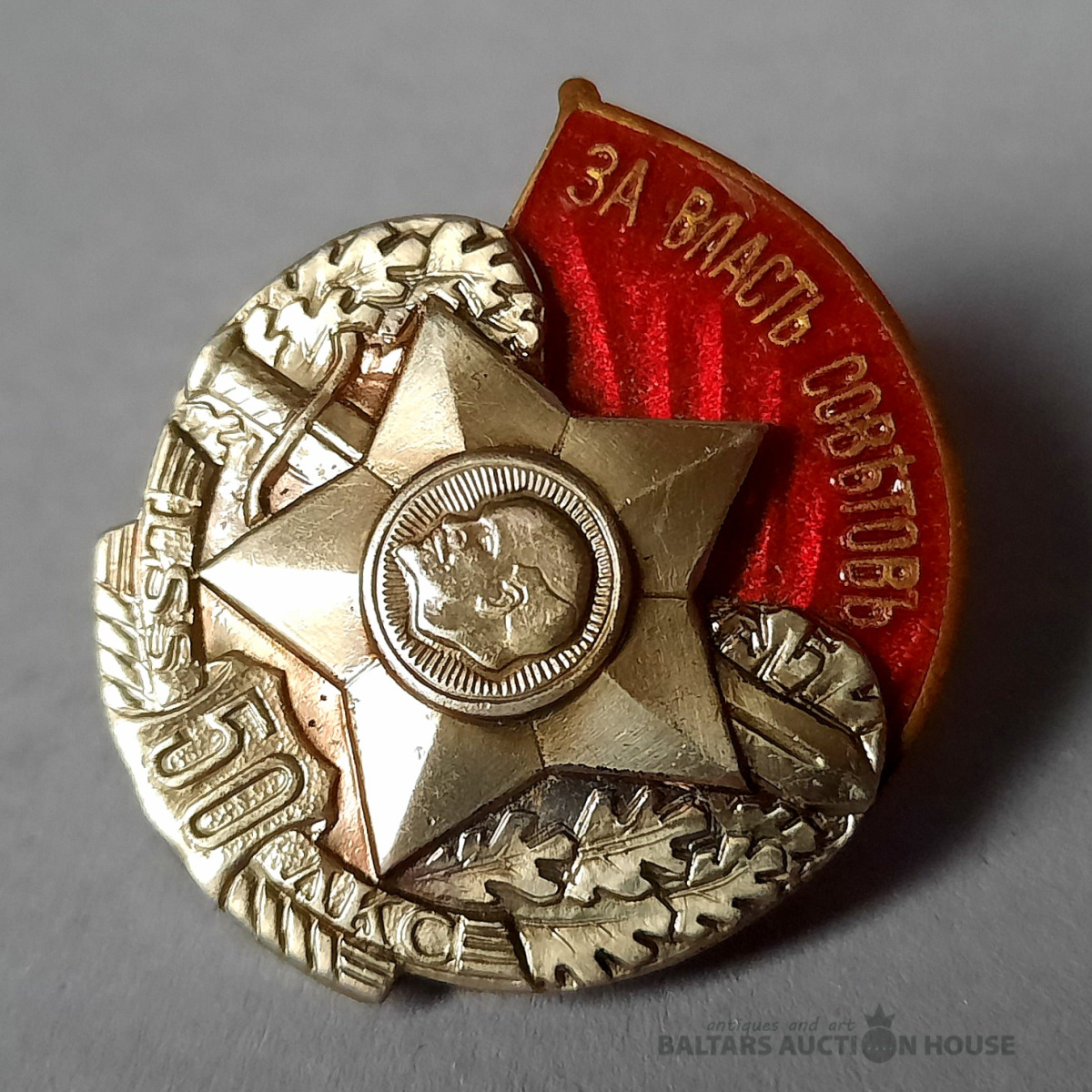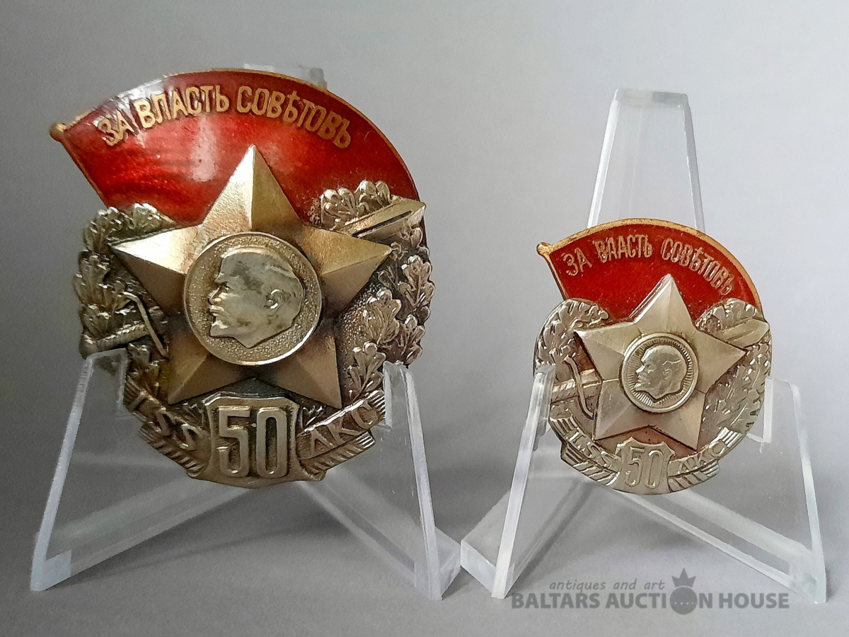 Nozīmju komplekts, Latviešu sarkano strēlnieku (LSS) 50 gadu jubileja, liels + mazs izmēri, Latvija, PSRS, 20.gs. 60ie gadi, 45 x 38 / 31 x 27.6 mm.