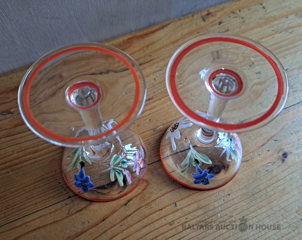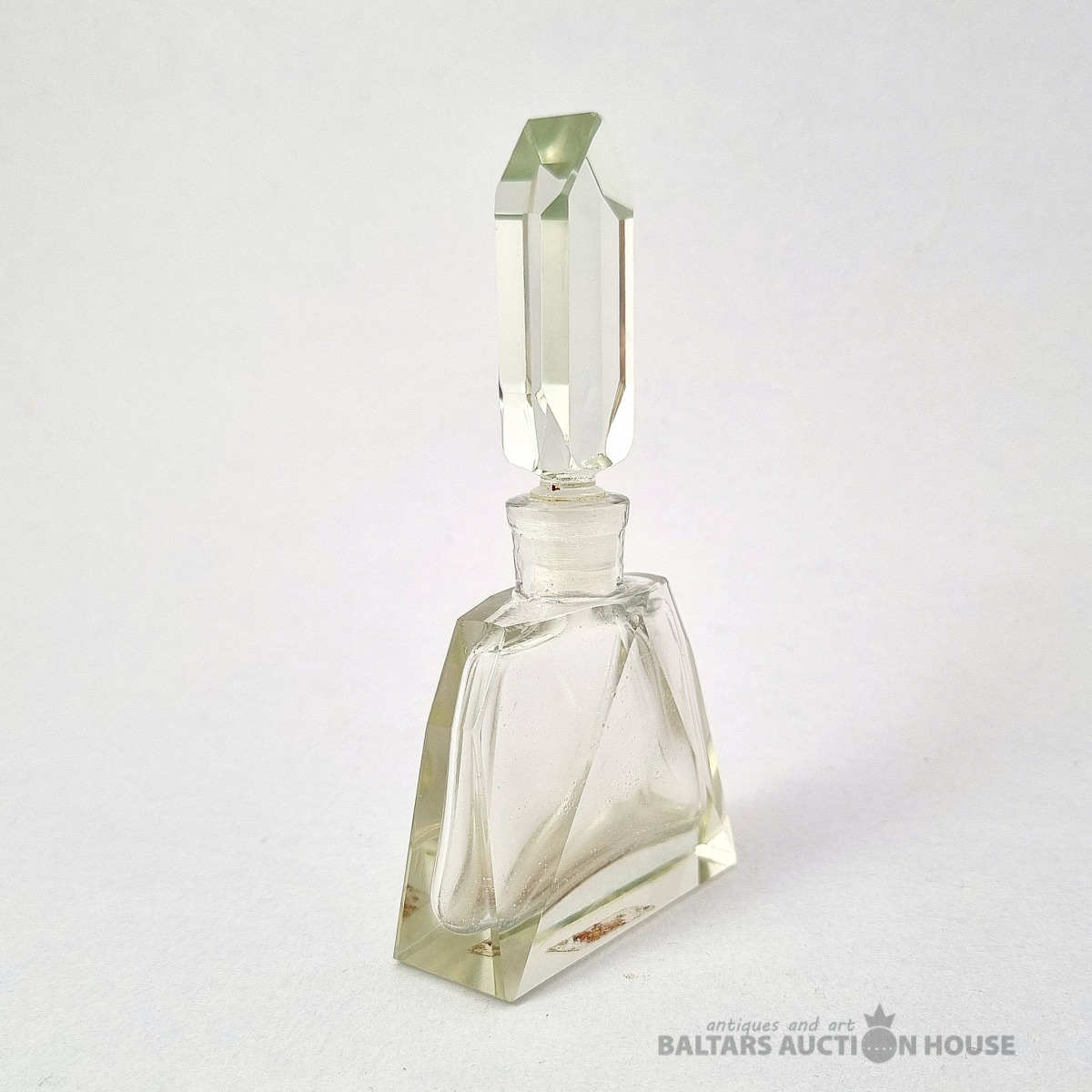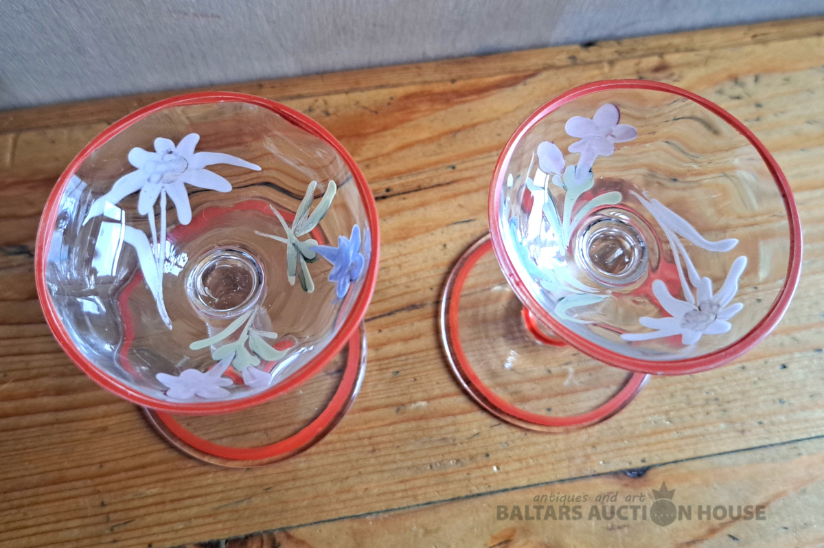 ***Manufaktura FRITZ (Frīdrihs Vilhelms) HECKERT***Krūkas formas dekantere ar korķi. Caurspīdīgs, krāsots stikls, augstums 25 cm. Silēzija, Petersdorfa (tagad Pehovice), ap 1880. gadu. Apaļš, piepūšams kāts; tievs, olveida korpuss ar ziedu rakstu. Caurspīdīgs, C veida rokturis. Īss kakliņš. Piepūšams korķis ar smailu galu.
