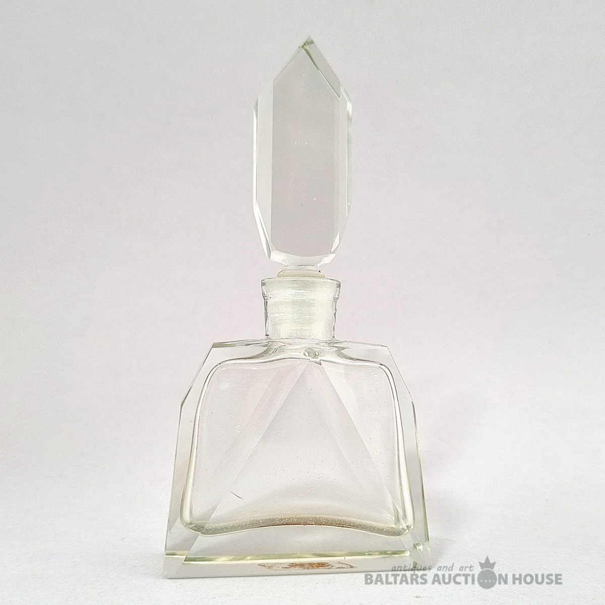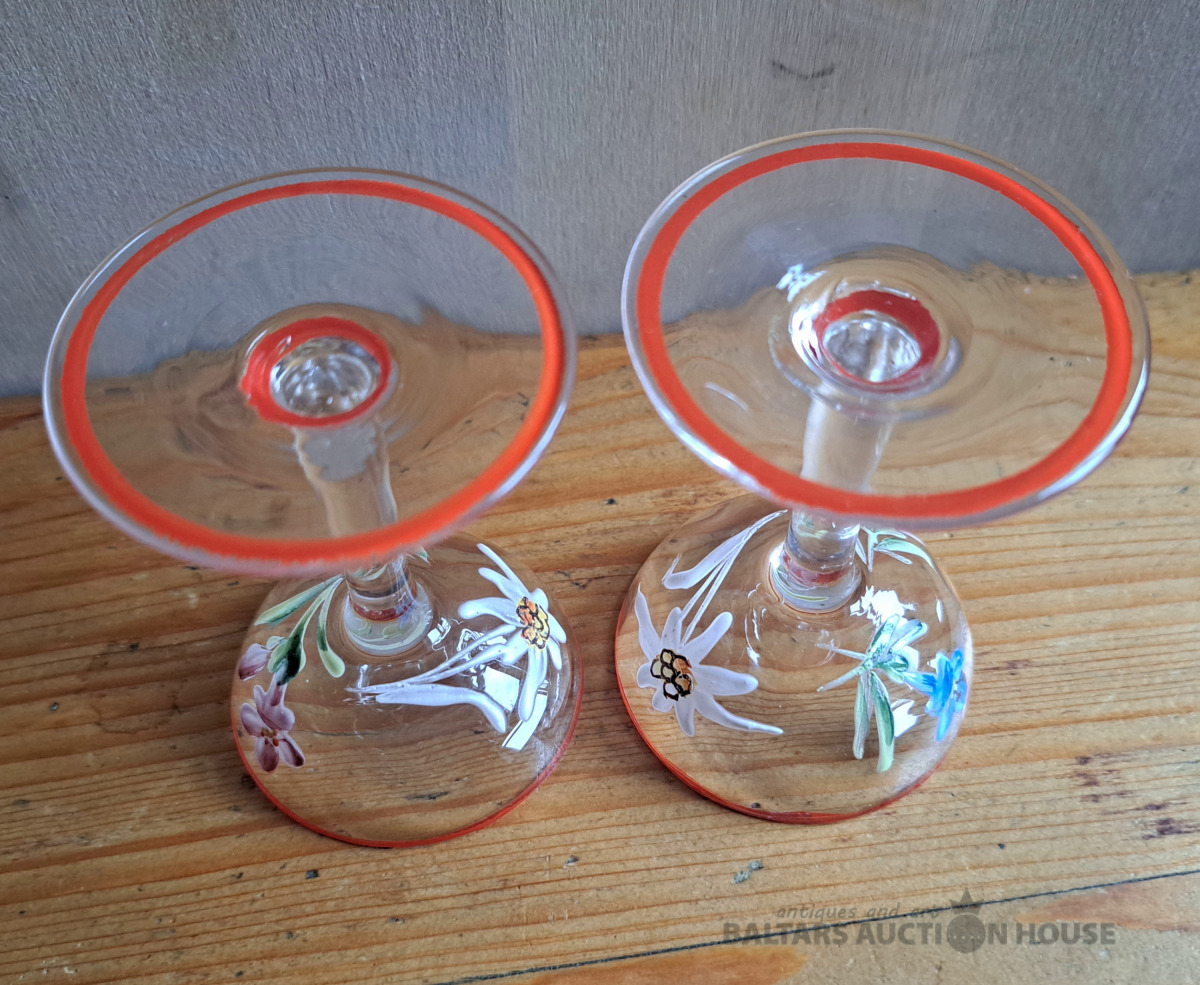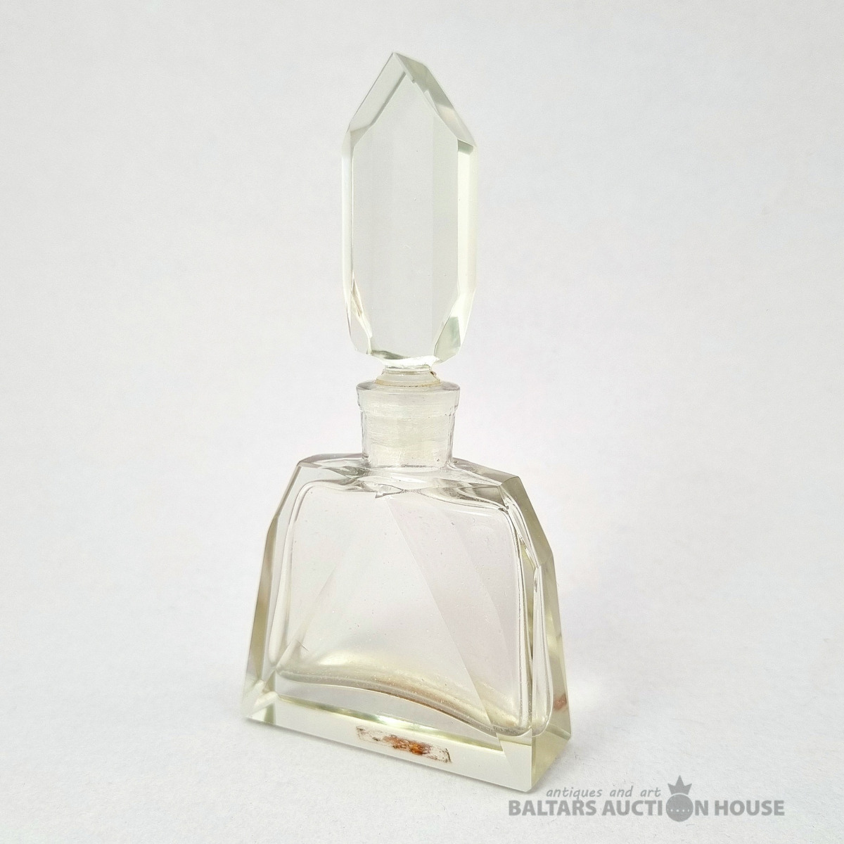 ***Manufaktura FRITZ (Frīdrihs Vilhelms) HECKERT***Krūkas formas dekantere ar korķi. Caurspīdīgs, krāsots stikls, augstums 25 cm. Silēzija, Petersdorfa (tagad Pehovice), ap 1880. gadu. Apaļš, piepūšams kāts; tievs, olveida korpuss ar ziedu rakstu. Caurspīdīgs, C veida rokturis. Īss kakliņš. Piepūšams korķis ar smailu galu.