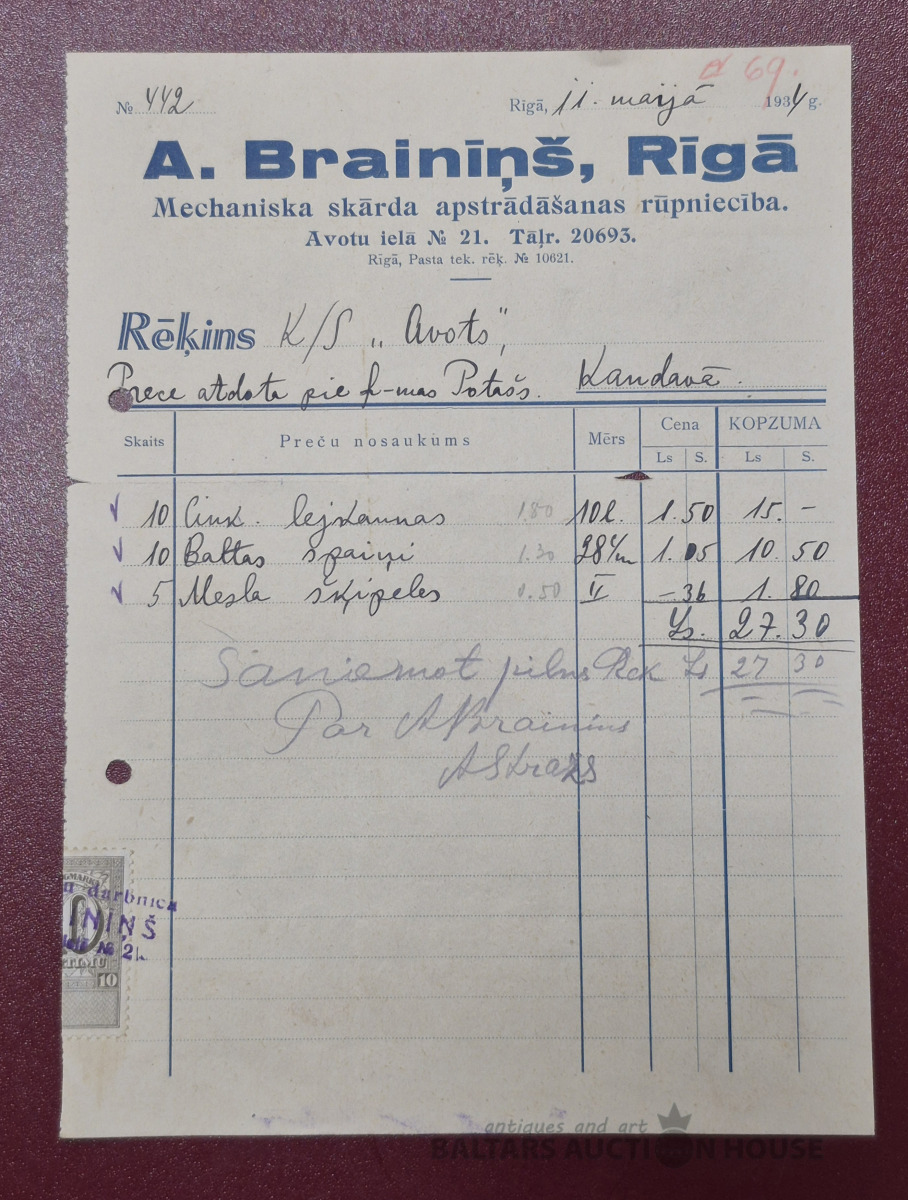 Rēķins. Mehāniskā skārda apstrādāšanas rūpniecība "A. Brainīņš", Rīgā 1934g.