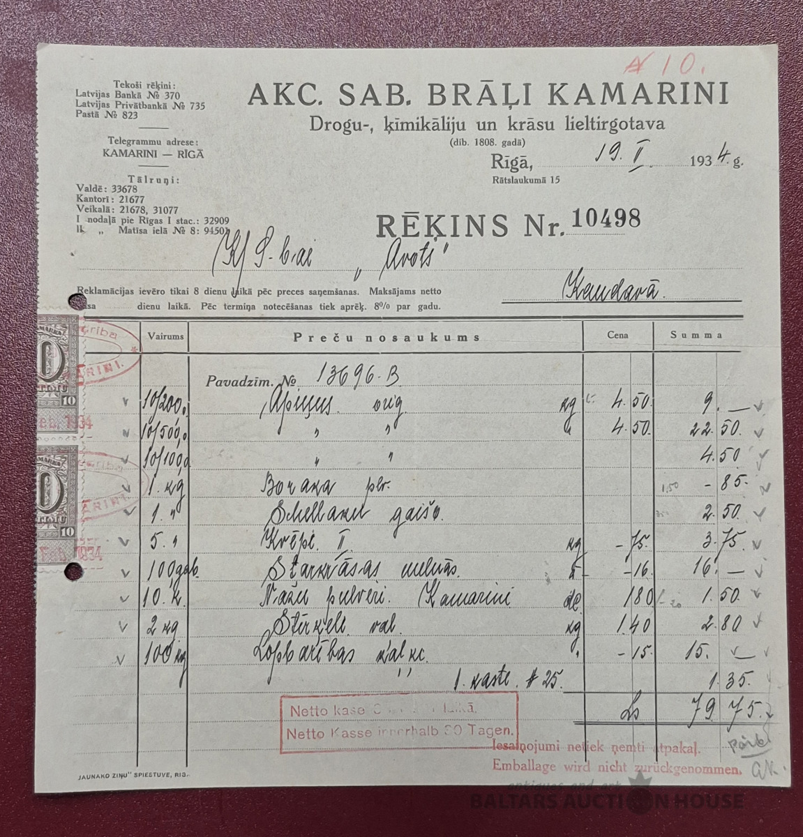 Rēķins. Drogu-, ķimikāliju un krāsu lieltirgotava Akc.Sab. "Brāļi Kamarini", 1934g.