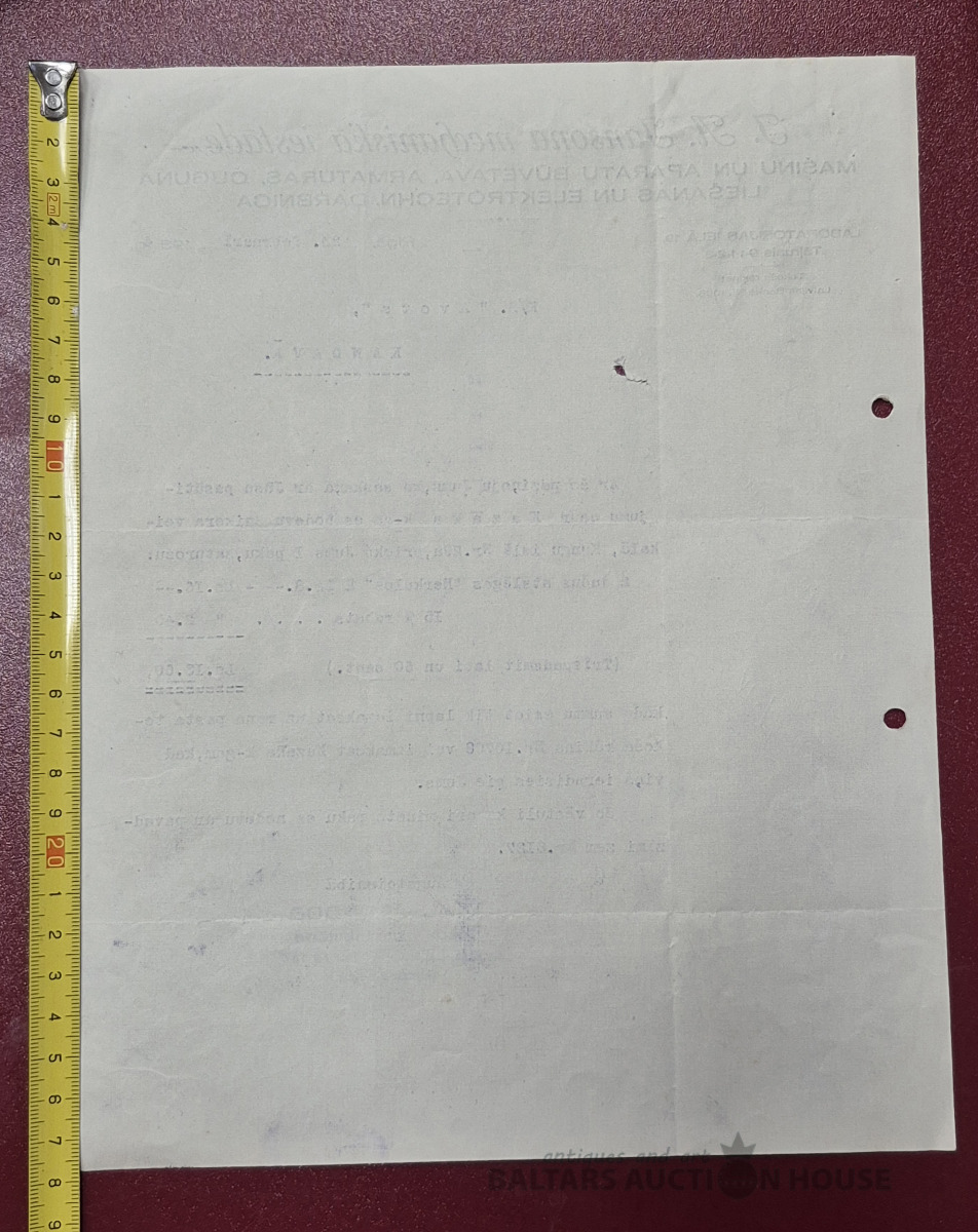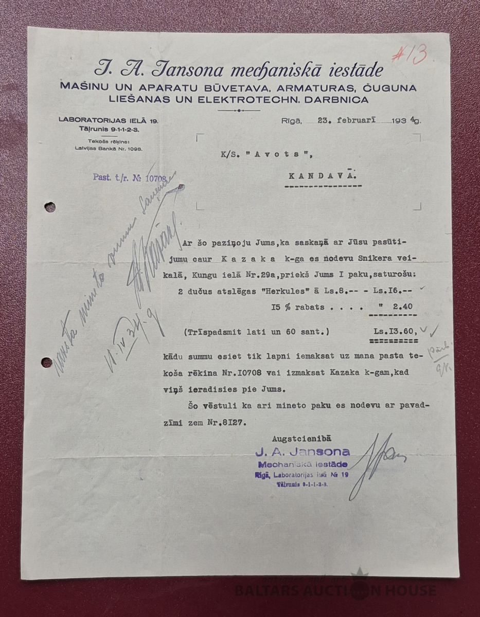 Dokuments. Mašīnu un aparātu būvētava "J. A. Jānonāk mehāniskā iestāde", 1934g.