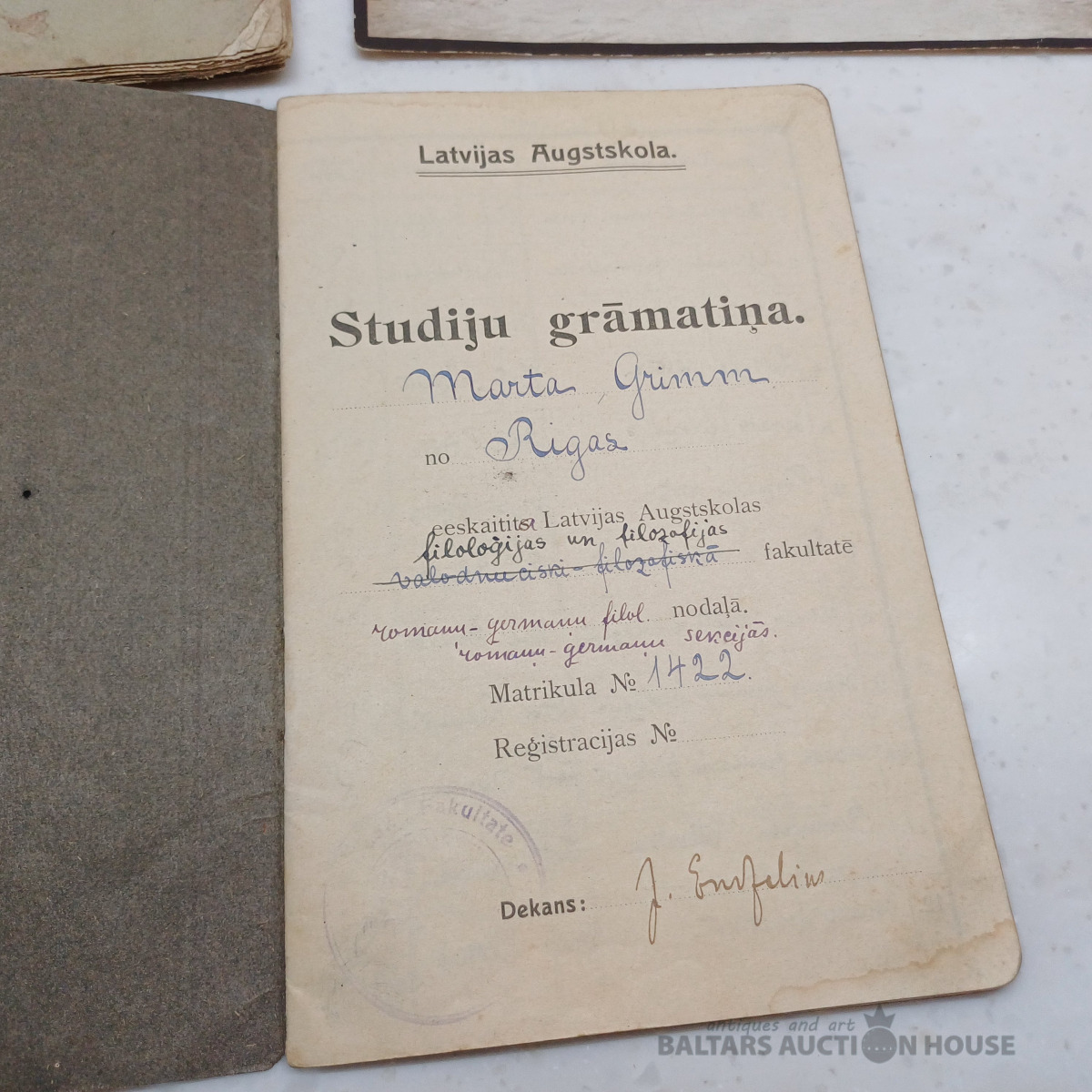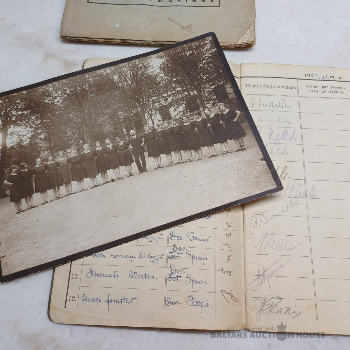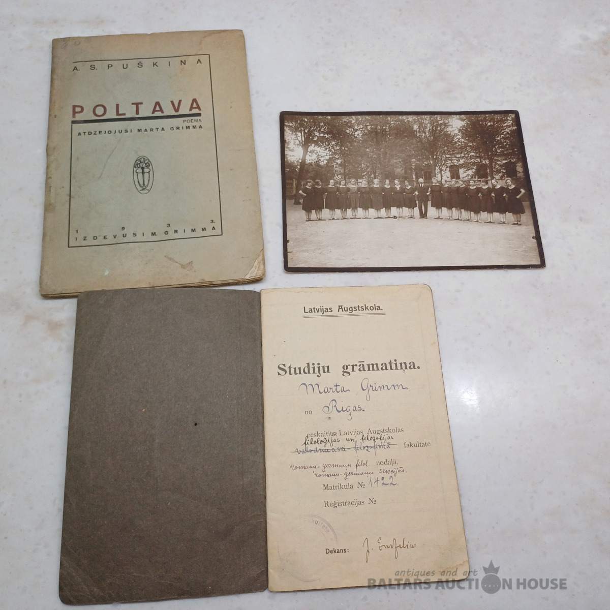 Dzejnieces, rakstnieces MARTAS GRIMMAS dokumenti – LU studiju grāmatiņa + foto no vingrošanas kursiem (dzejniece 5. no kreisās). Ar pasniedzēju parakstiem, atzīmēm zīmogiem u.c.