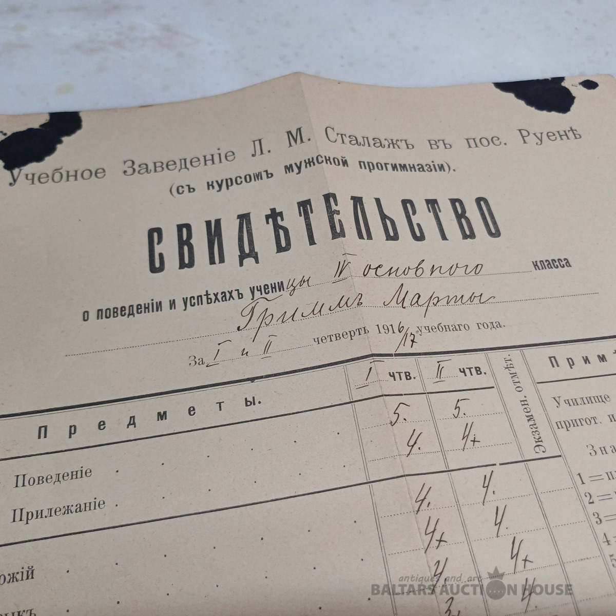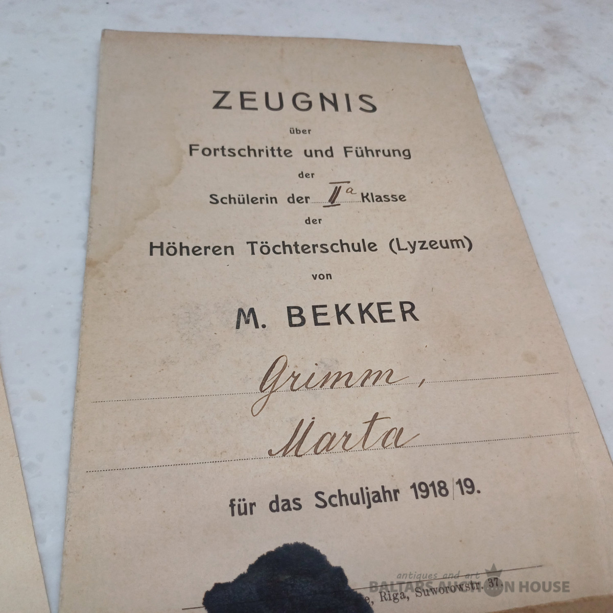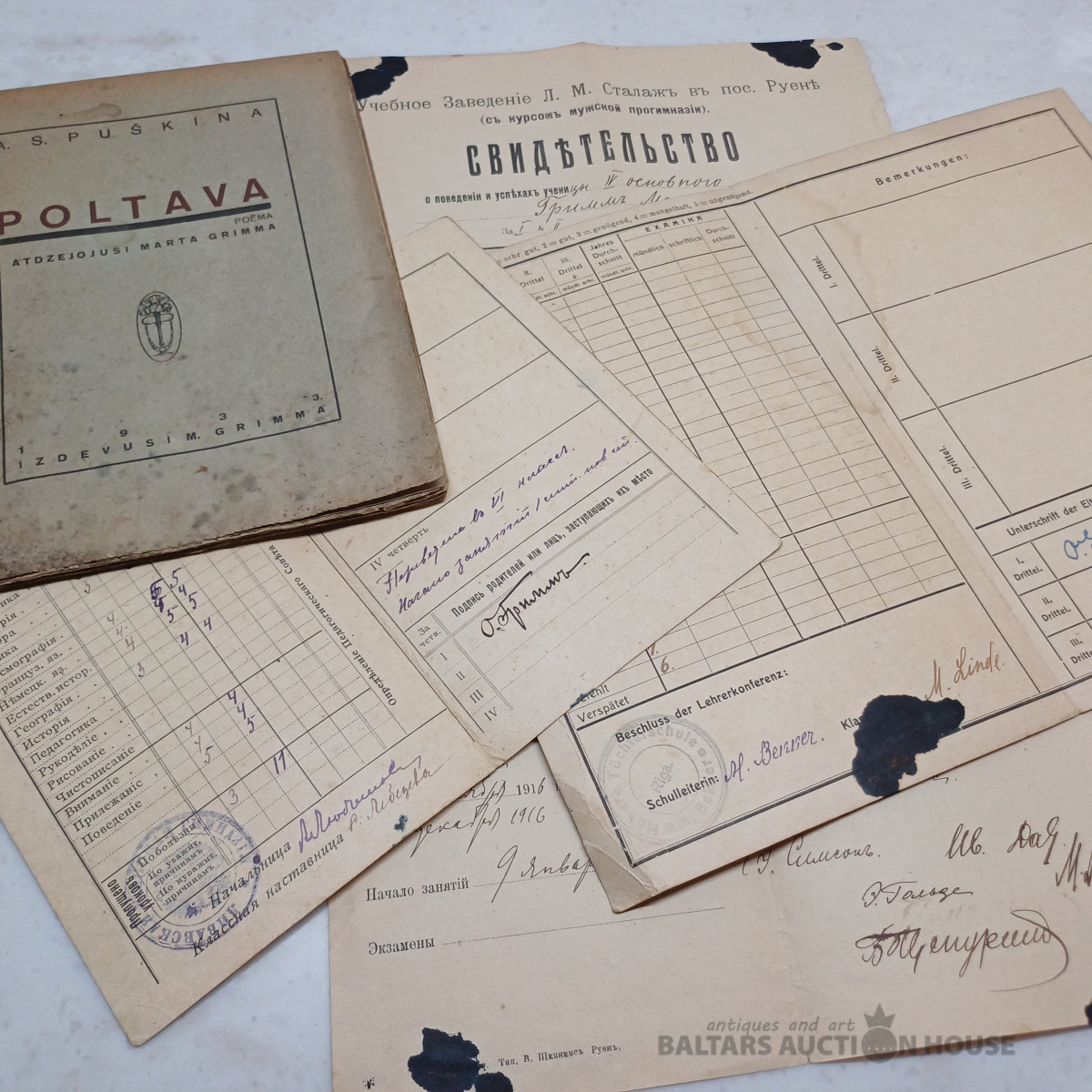 Dzejnieces, rakstnieces MARTAS GRIMMAS dokumenti – mācību liecības no 1916.–1919. g. Ar parakstiem, atzīmēm zīmogiem u.c.