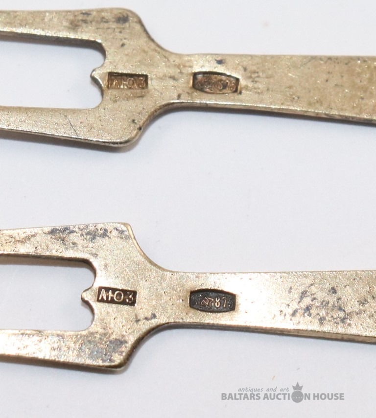 Dakšiņas 6 gab. Sudrabs 875, zeltījums, emalja. Svars 33,37 g. l=9,4 cm