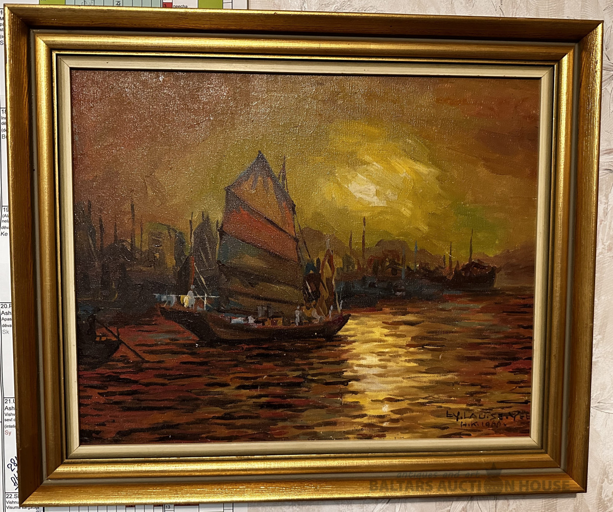 Glezna MĀJUPCEĻŠ SAULRIETĀ, eļļa, audekls, parakstīta, datēta 1966.g., Vjetnamas līcis, gleznas lielums 37.0x45.5 cm, antīks koka rāmis ar profilu 50x35 mm, lielums ar rāmi 45x54 cm.