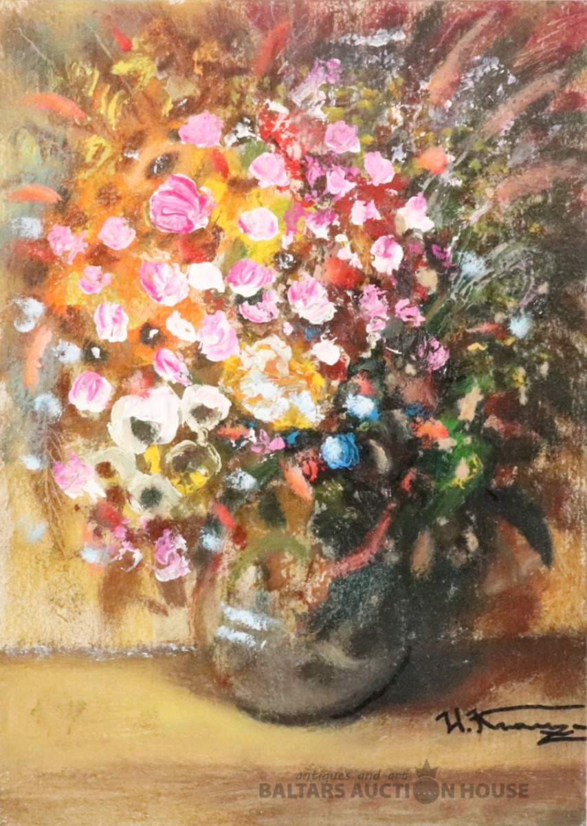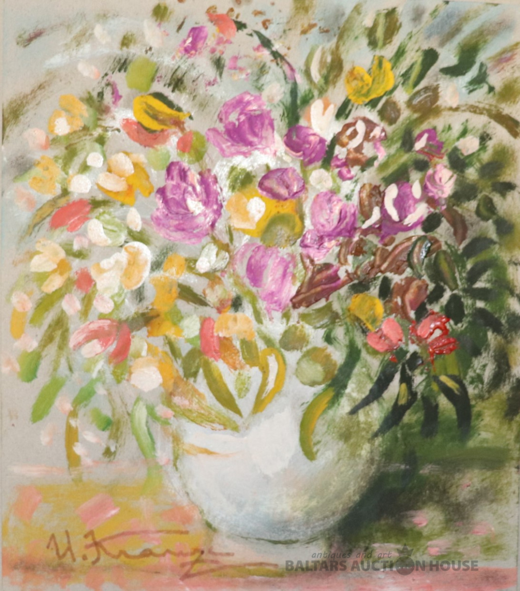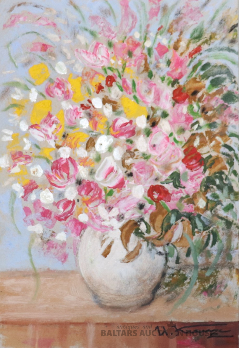 Uldis Krauze (1958). ZIEDI BALTĀ VĀZĒ. Kartons, jaukta tehnika. 31,5x19,8 cm