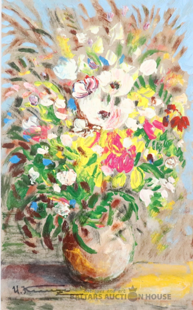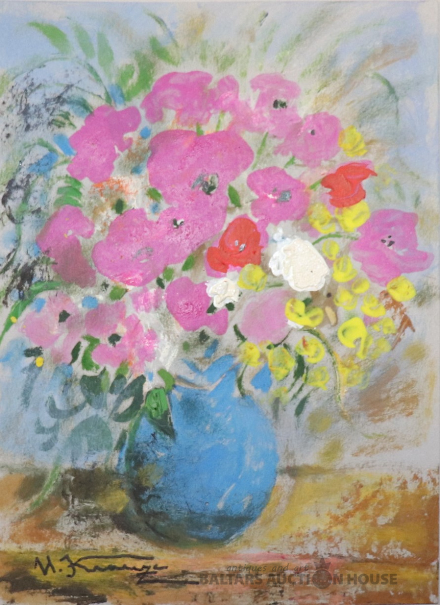 Uldis Krauze (1958). ZIEDI ZILĀ VĀZĒ. Kartons, jaukta tehnika. 30,5x22,5 cm