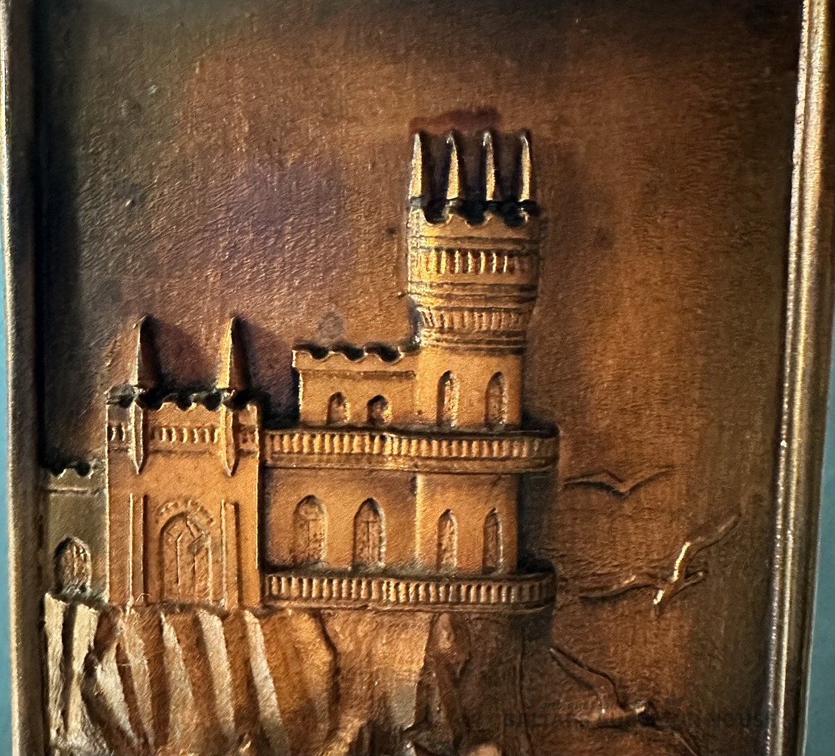 Sienas dekors ar termometru, PSRS, 1970-tie gadi, kalts kapara panelis ar Krimas simbolu - Neogotikas stila viduslaiku pili "Bezdelīgas ligzda", kas atrodas uz 40m augstas klints pie Melnās jūras, lielums 24x10 cm, svars 325 gr., bez defektiem, termometrs nomainīts uz Skandināvu kvalitātes produktu. Pēdējam foto informatīvs raksturs.