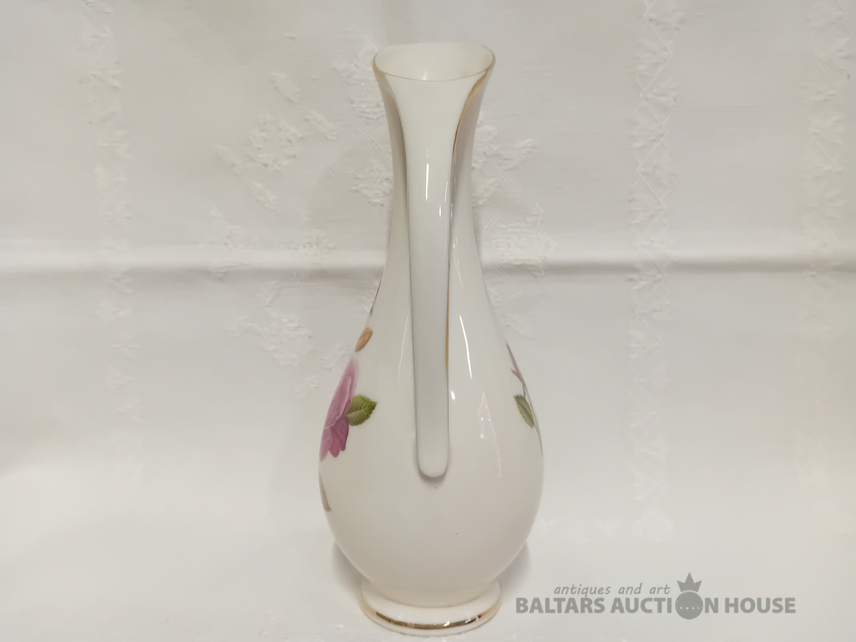 Porcelāna vāzīte, rokas gleznojums, 20 cm h, Vācija, , Krāsas paliekas -divas gaišas svītras ārpusē, zelta paliekas-sīku, pelēku švīku veidā-vāzei iekšpusē, cita veida defektu nav.