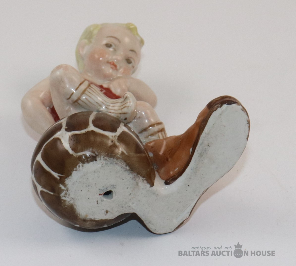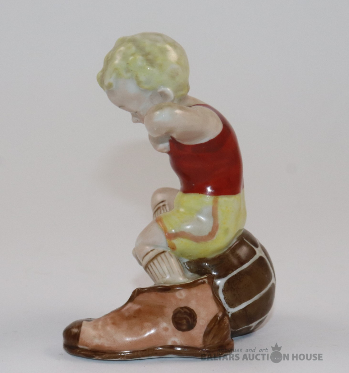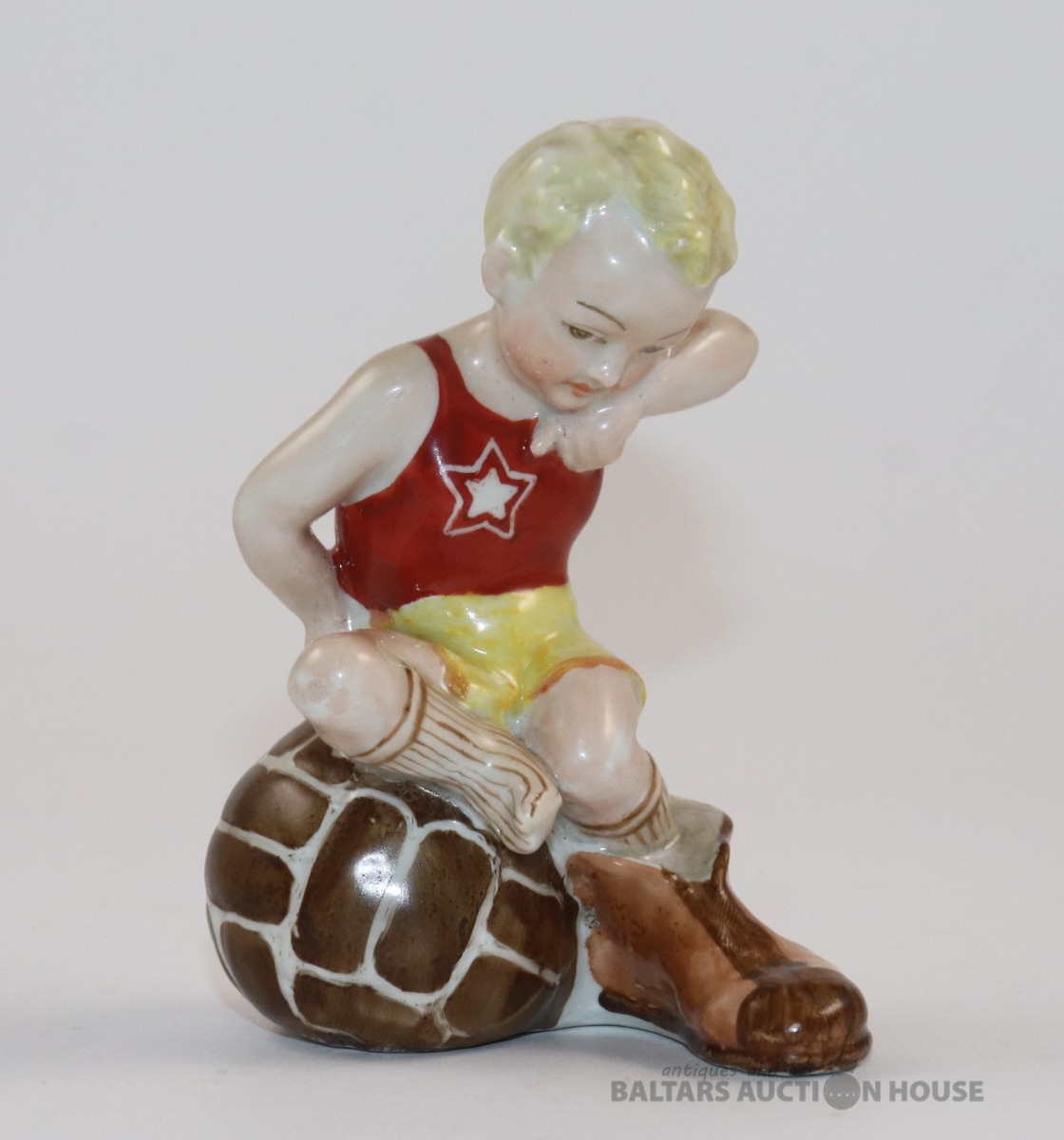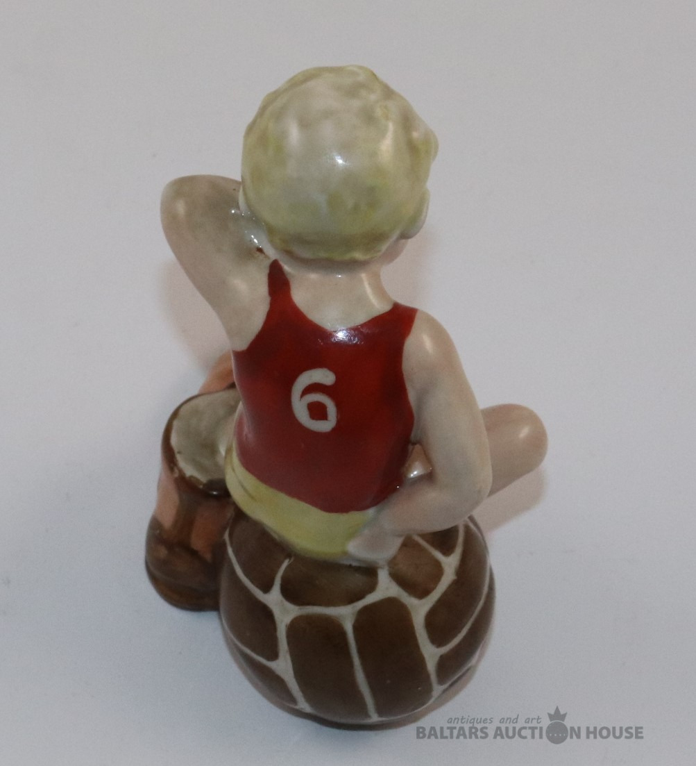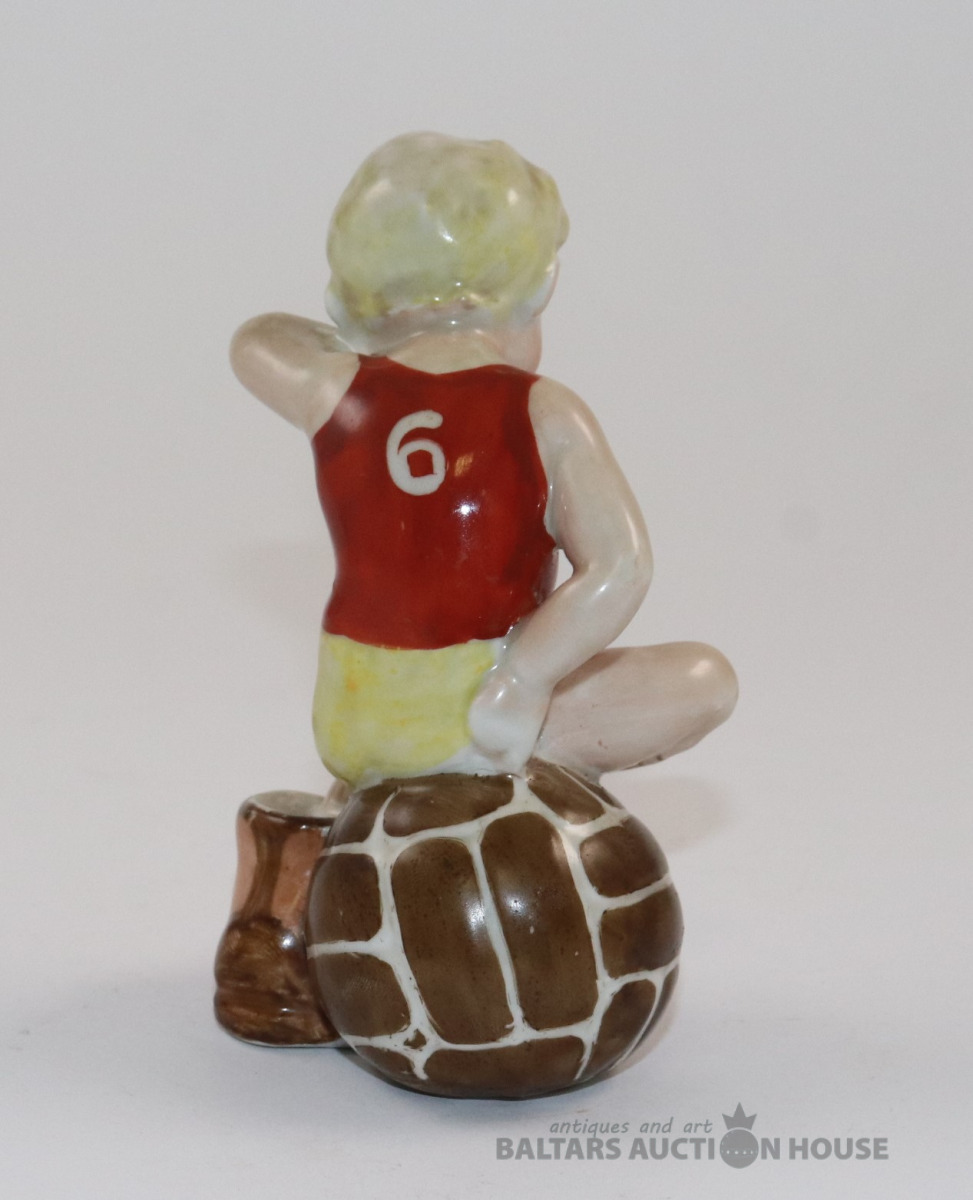Figūra FUTBOLISTS UZ BUMBAS. Porcelāns, roku gleznojums. RPF. h=12 cm