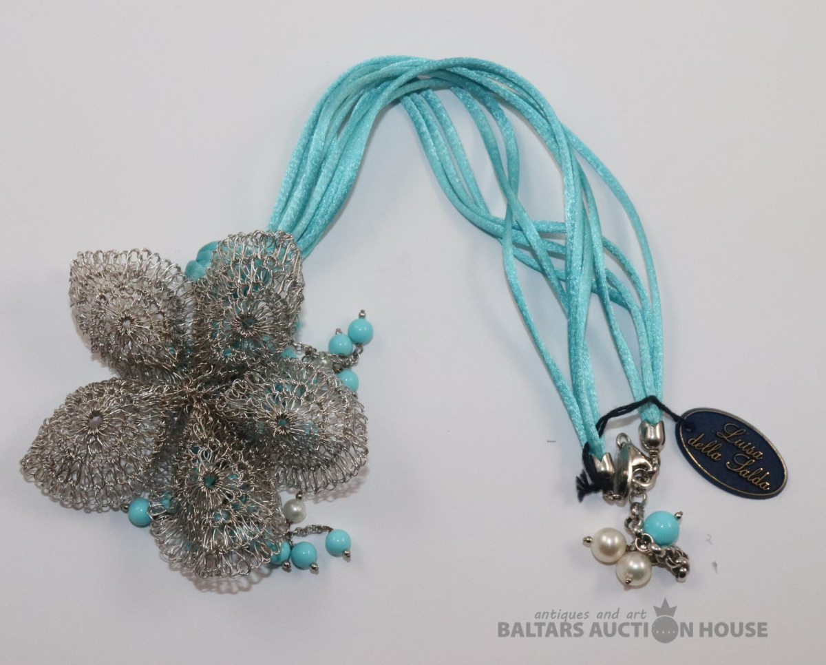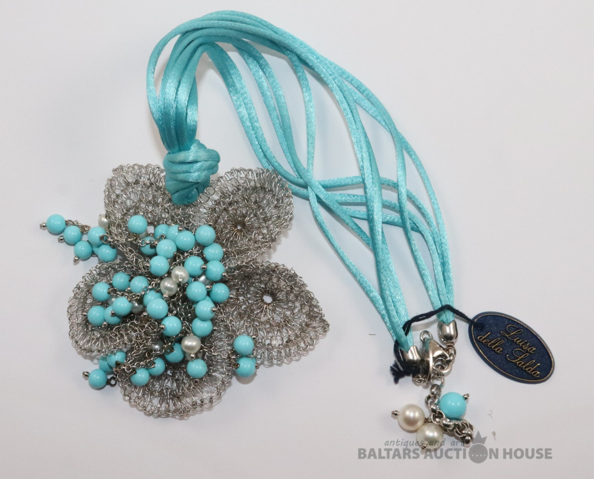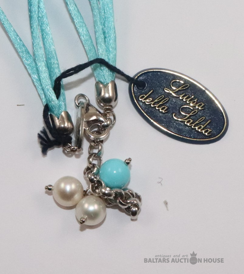 Kaklarota. Zila tirkīza pērlītes, dabīgās pērles, Sudrabs 925 prove.