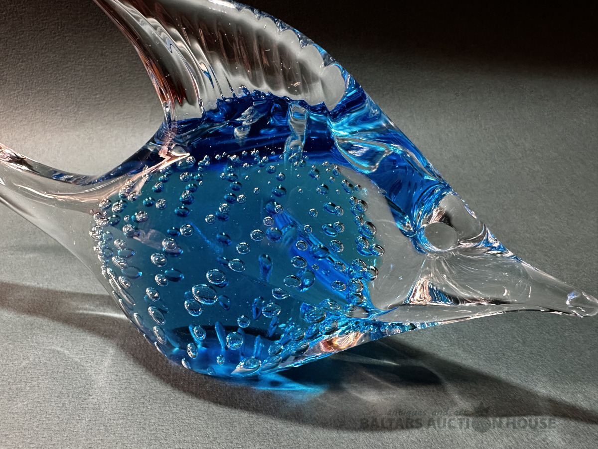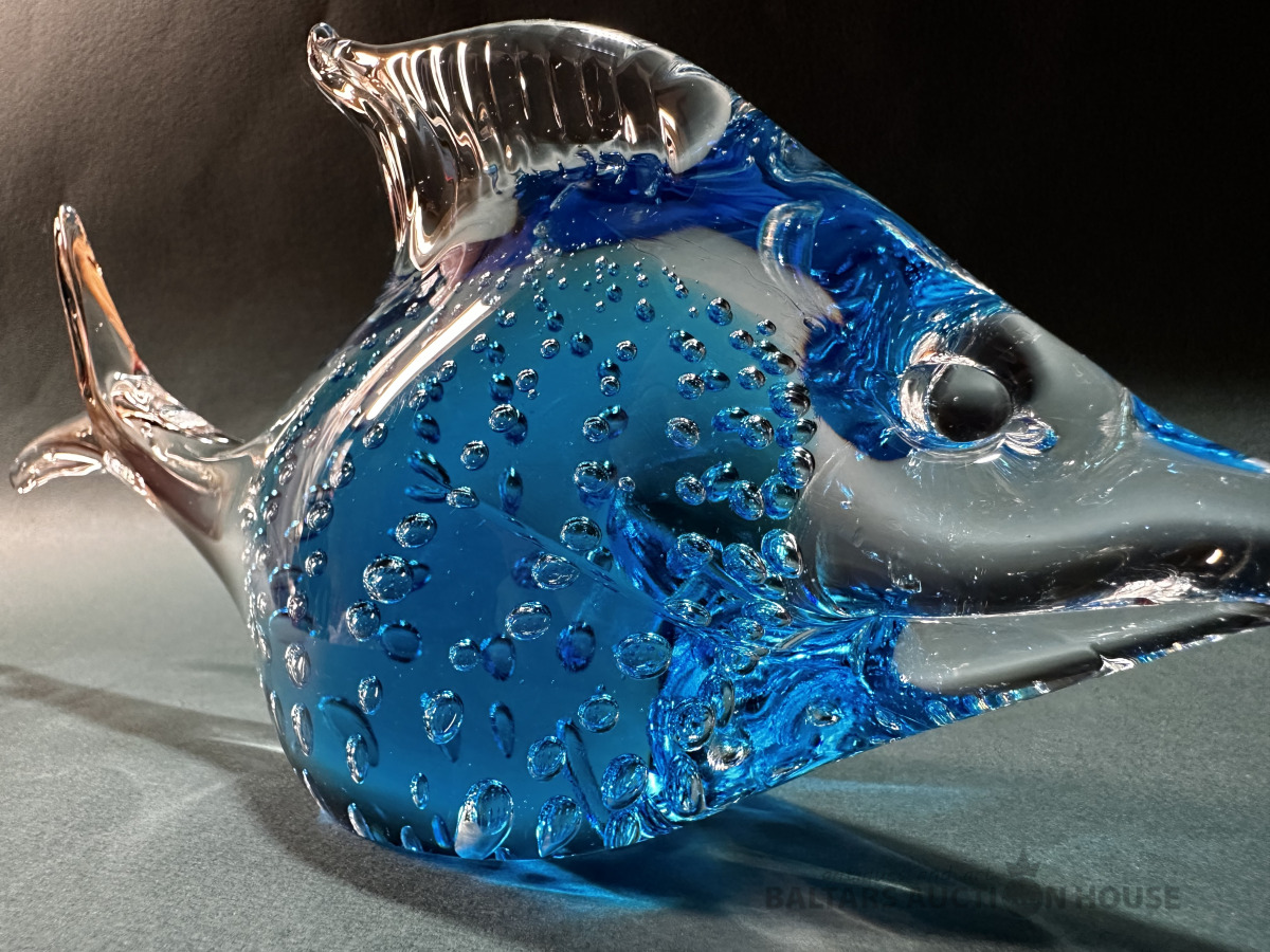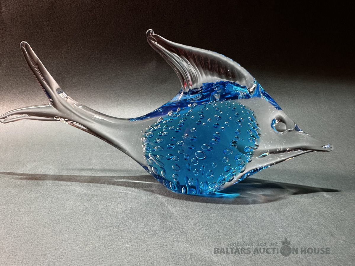 Interjera priekšmets ZIVS, iespaidīgs izskats, nav lietošanas pazīmju, lielums 27 cm ,izgatavota laika posmā 1970.-1973.g., Zviedrija, Konstglass, roku darbs, rets eksemplārs, tika izgatavoti 100 eksemplāri, visi skaistajā zilajā krāsā ar gaisa burbuļiem, dizainu radīja zviedriete Inga Liile Fare, kas ieprecējās stikla dizaineru brāļu Marcolinu dzimtā, kompānijas dibinātāji iepriekš amatu bija apguvuši Itālijā Venēcijā Murano salā un strādajuši vēl divās zviedru stikla dizaina kompānijās, pirms dibināja savu uzņēmumu. Konstglass vairākkārt mainīja nosaukumu un pat atrašanās vietu, aptuveni ap 1991. gadu beidza pastāvēt. Kontrolēto stikla burbuļu tehnoloģiju radīja Orrefors 1930-jos.