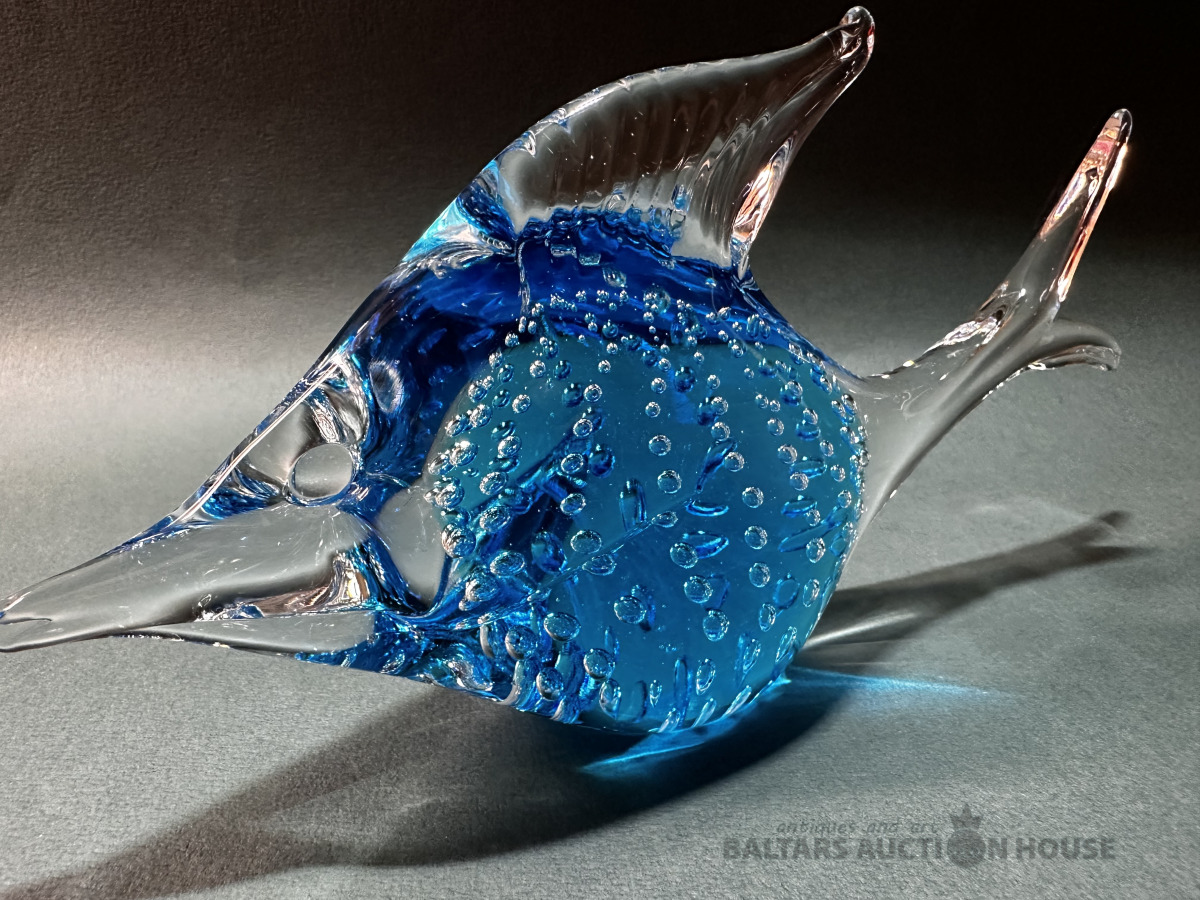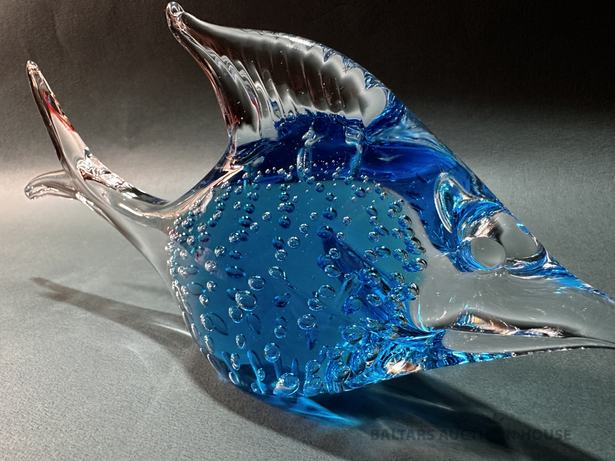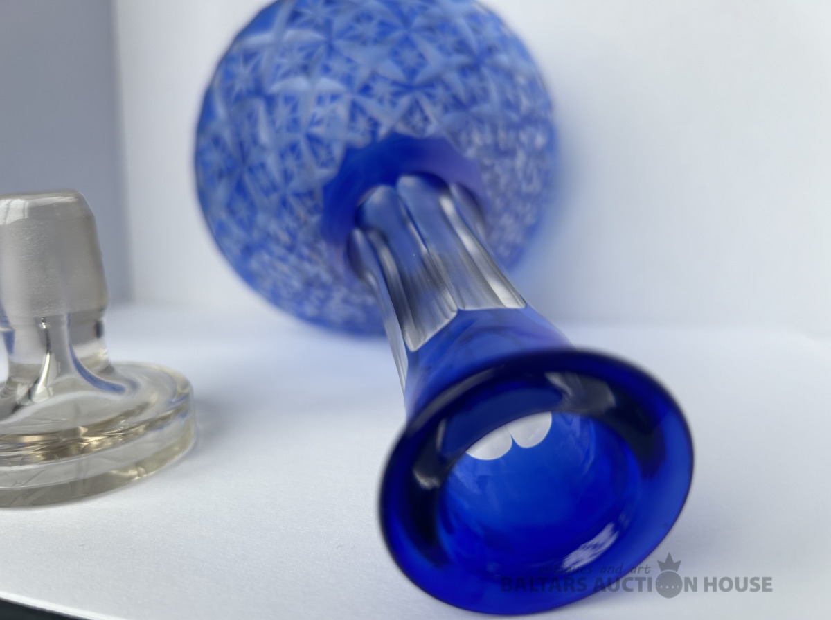 Interjera priekšmets ZIVS, iespaidīgs izskats, nav lietošanas pazīmju, lielums 27 cm ,izgatavota laika posmā 1970.-1973.g., Zviedrija, Konstglass, roku darbs, rets eksemplārs, tika izgatavoti 100 eksemplāri, visi skaistajā zilajā krāsā ar gaisa burbuļiem, dizainu radīja zviedriete Inga Liile Fare, kas ieprecējās stikla dizaineru brāļu Marcolinu dzimtā, kompānijas dibinātāji iepriekš amatu bija apguvuši Itālijā Venēcijā Murano salā un strādajuši vēl divās zviedru stikla dizaina kompānijās, pirms dibināja savu uzņēmumu. Konstglass vairākkārt mainīja nosaukumu un pat atrašanās vietu, aptuveni ap 1991. gadu beidza pastāvēt. Kontrolēto stikla burbuļu tehnoloģiju radīja Orrefors 1930-jos.