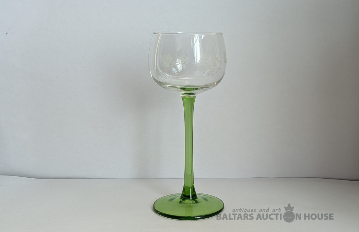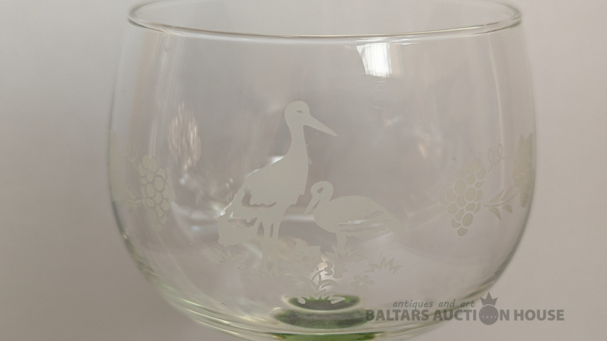Eleganta Rhine Cristallin glāze Elzasas baltvīnam ar stārķi, vīnogu ķekaru un vīnogulāju lapām