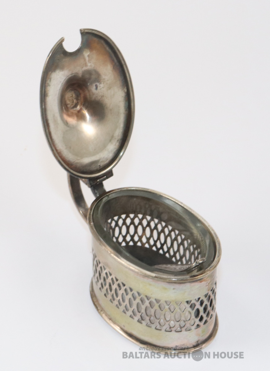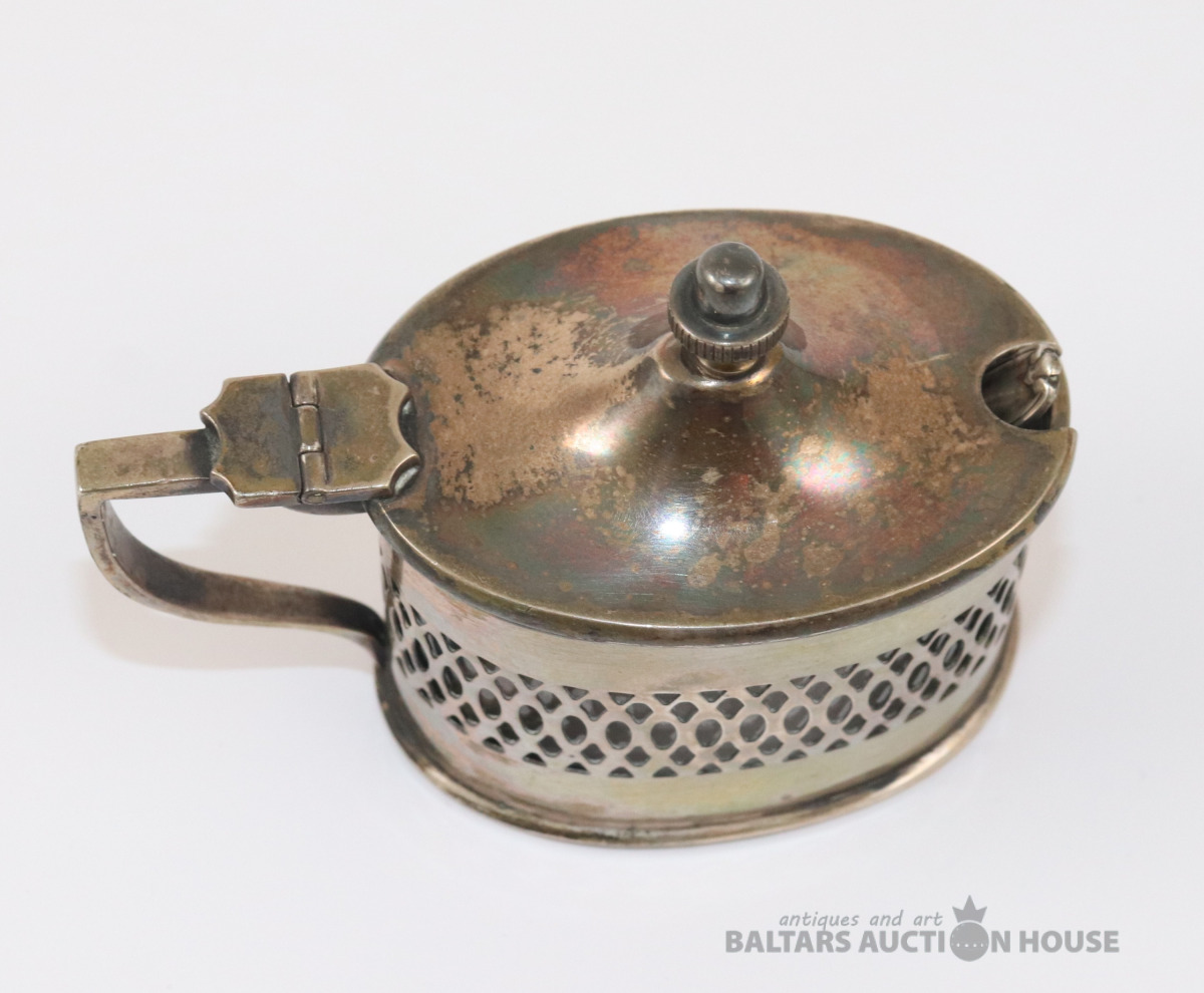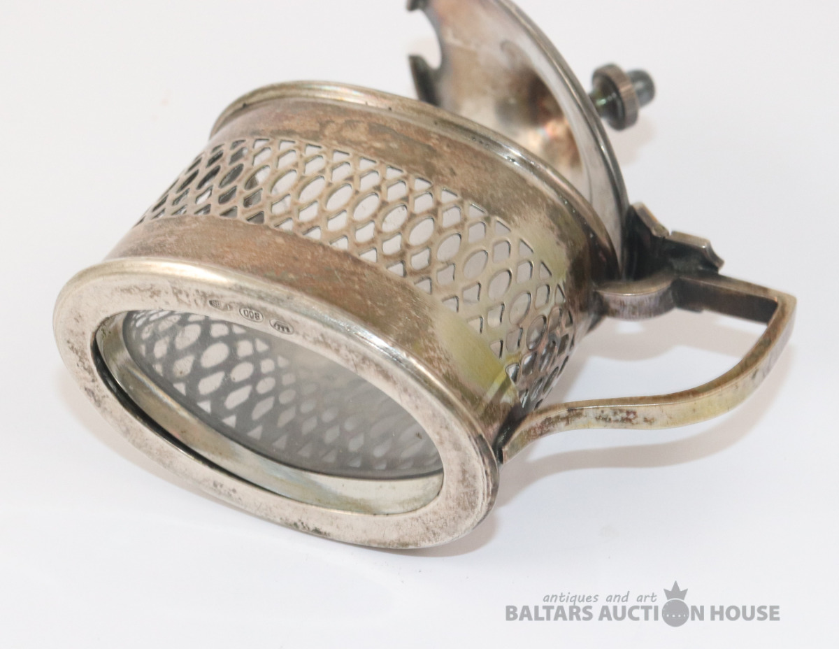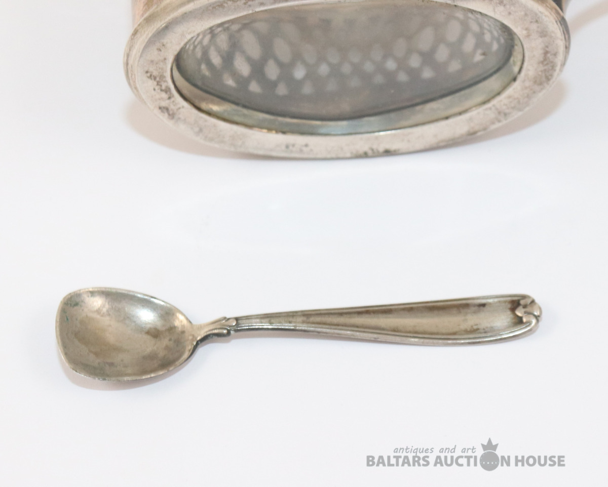 Sudraba trauks ar stikla ietvaru un karoti. Sudrabs 800. Svars bez stikla - 90,20 g. 6,5x4,4x6,7 cm. Karotes garums 7,2 cm