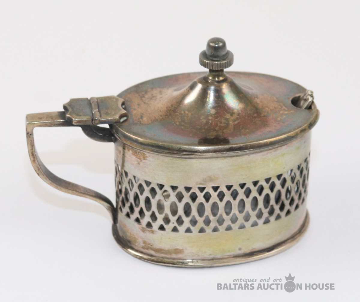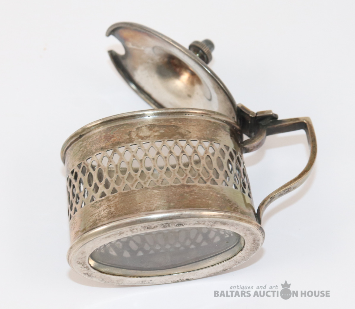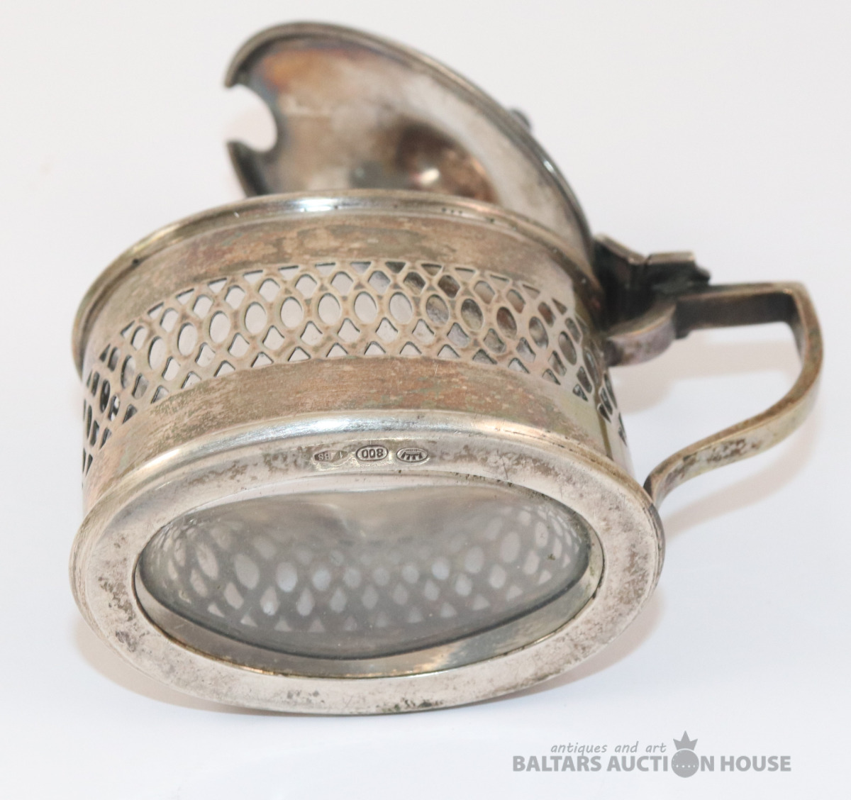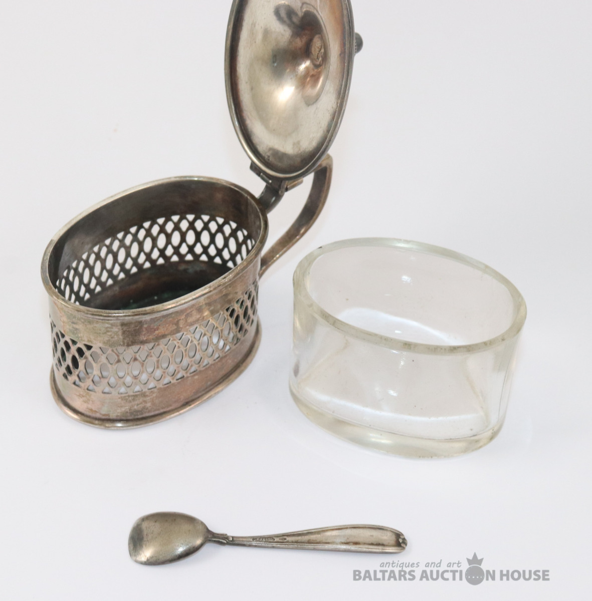 Sudraba trauks ar stikla ietvaru un karoti. Sudrabs 800. Svars bez stikla - 90,20 g. 6,5x4,4x6,7 cm. Karotes garums 7,2 cm