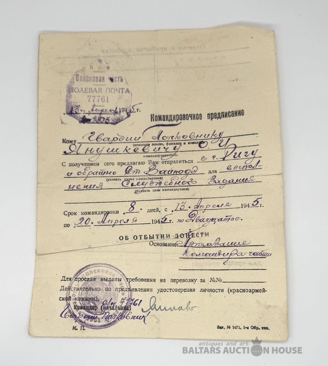 Dokuments WW2. Latviešu strēlnieks, pulkvedis Oskars Januškevičs.