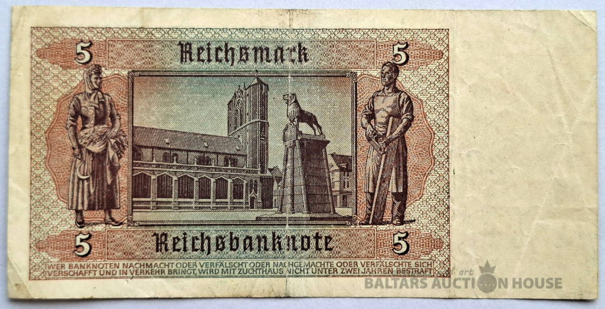 Vācijas 5 reihsmarku banknote, kas izlaista 1942. gadā.
