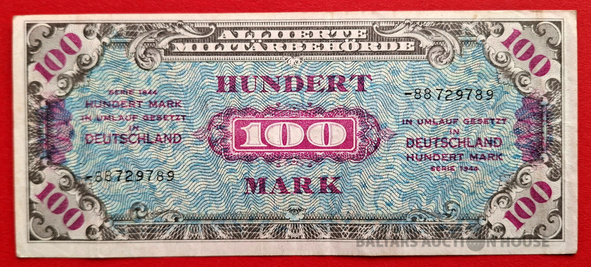 100 marku banknote no 1944. gada, ko izlaida sabiedroto okupācijas varas iestādes Vācijā. Šis ir kolekcionāra priekšmets, kas pazīstams kā kara valūta.