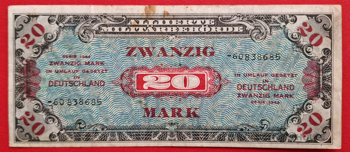 20 marku banknote no 1944. gada, ko izlaida sabiedroto okupācijas varas iestādes Vācijā. Šis ir kolekcionāra priekšmets, kas pazīstams kā kara valūta.