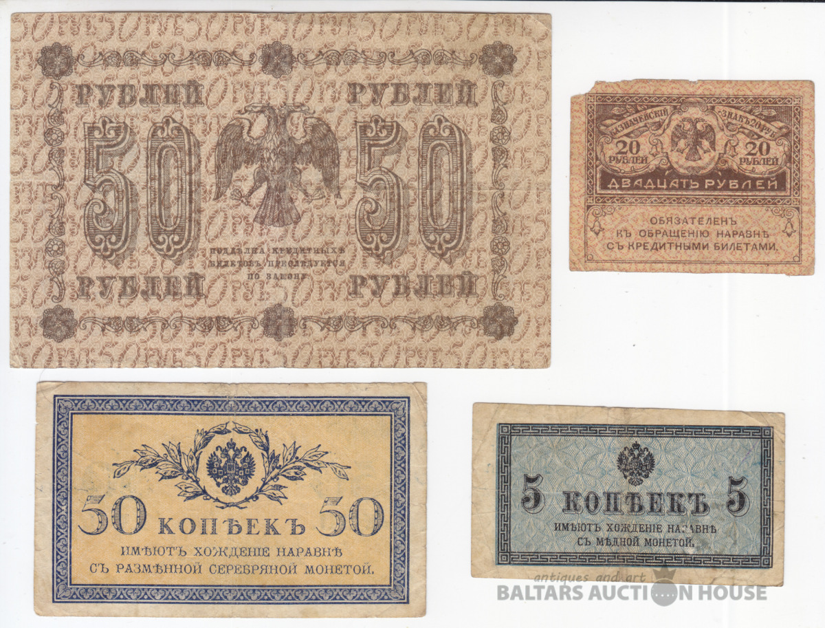 Banknotes, Krievija/Russia, 5, 50 kop. 1915, 20 Rubļi 1917, 50 rubli 1918.g.