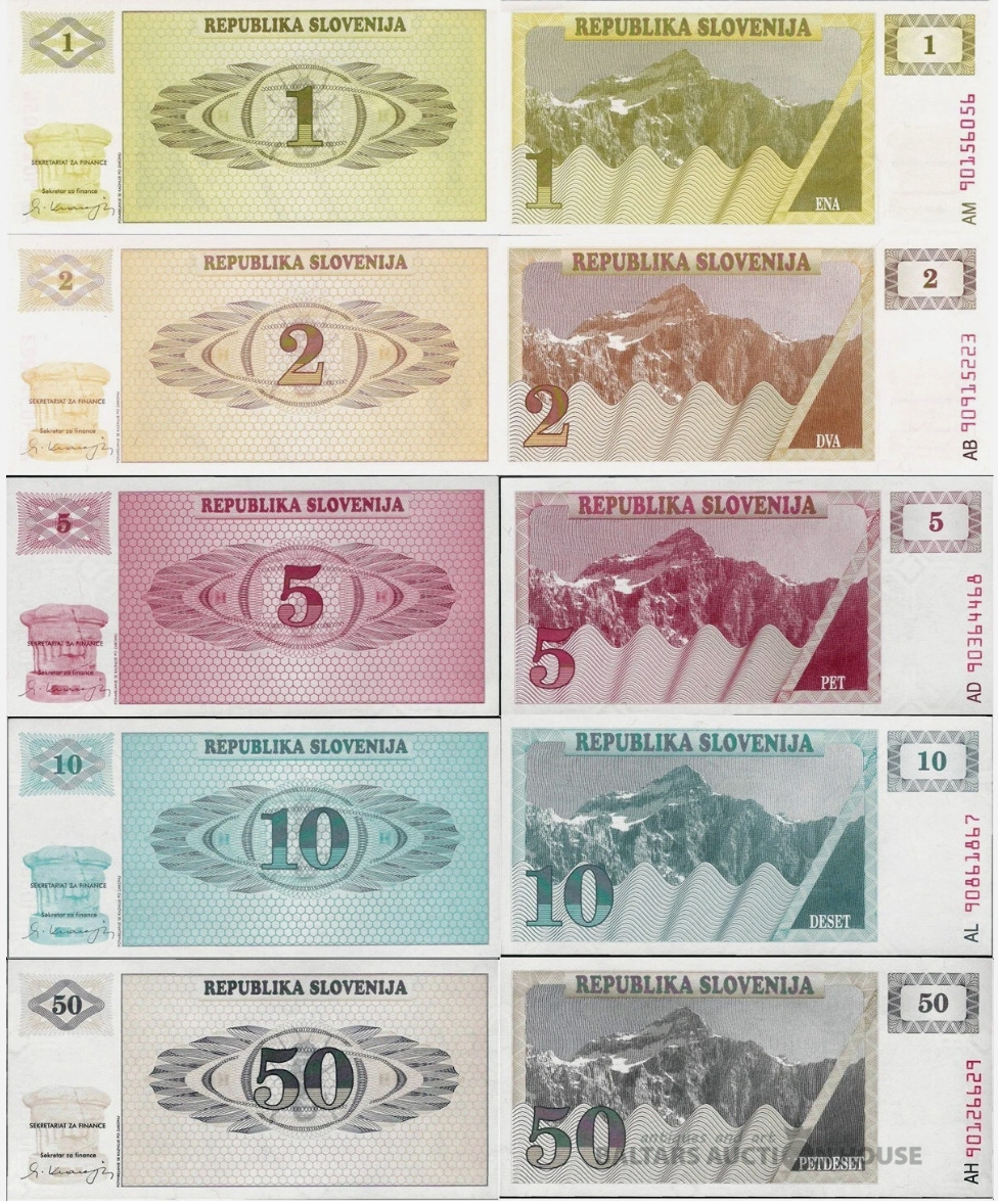 6 Banknotes komplekts, Slovēnija, 1, 2, 5, 10, 50, 100 Tolarjev, 1990, UNC
