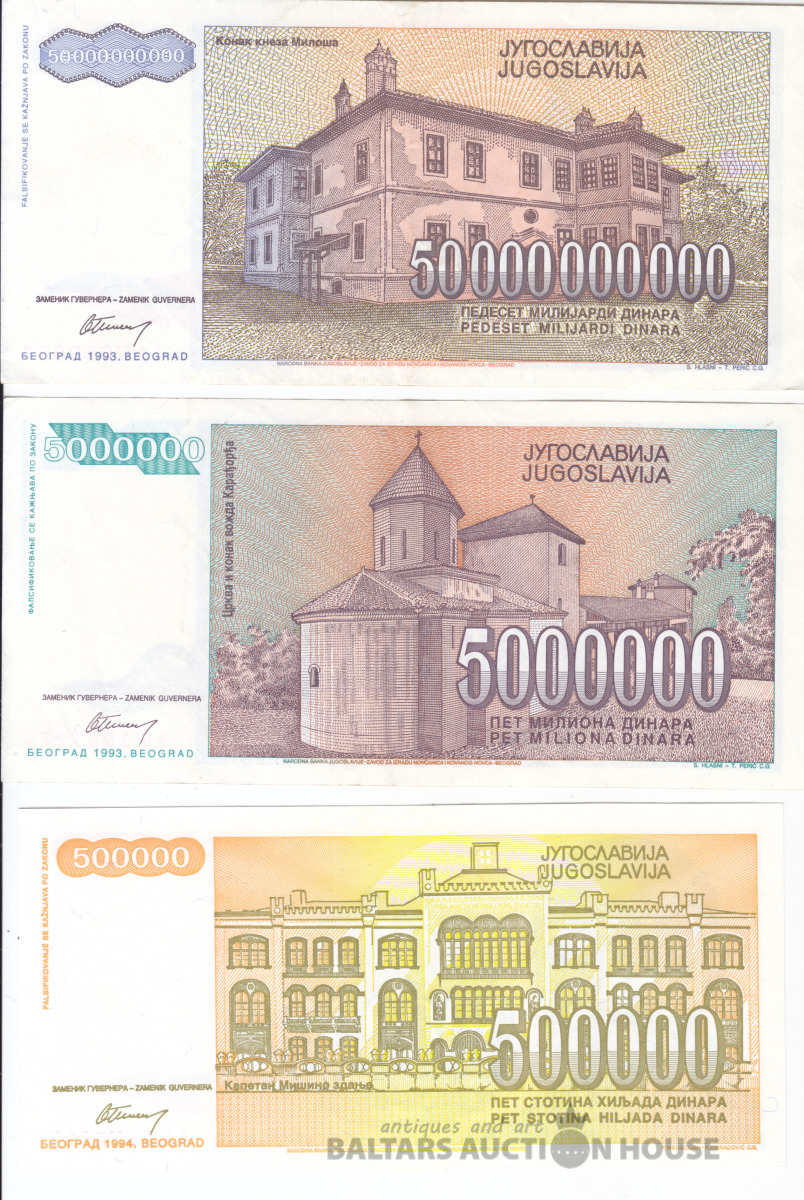 Banknotes, Jugoslavija/Yugoslavia, 500 000, 5 000 000, 50 miljardi 1993 UNC