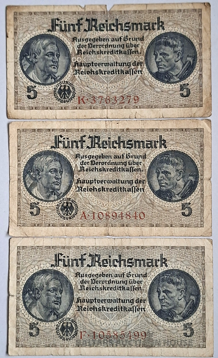 3 gab., 5 reihsmarku banknotes. Stāvoklis redzams fotoattēlā.
