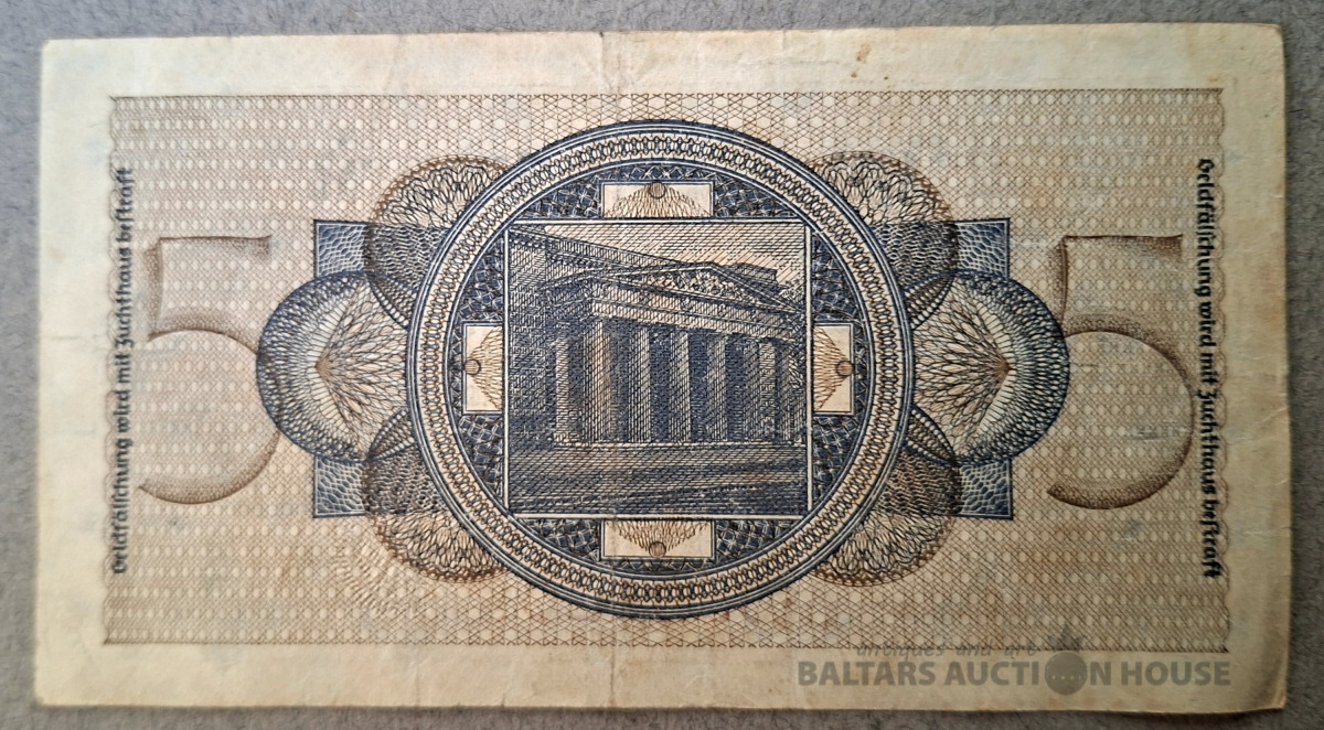 Vācijas 5 reihsmarku banknote (Reichskreditkassenschein), ko izdevusi Reichskräftschaftsgemeinschaft. Izdošanas valsts: Vācija. Izdošanas gads: 1940.