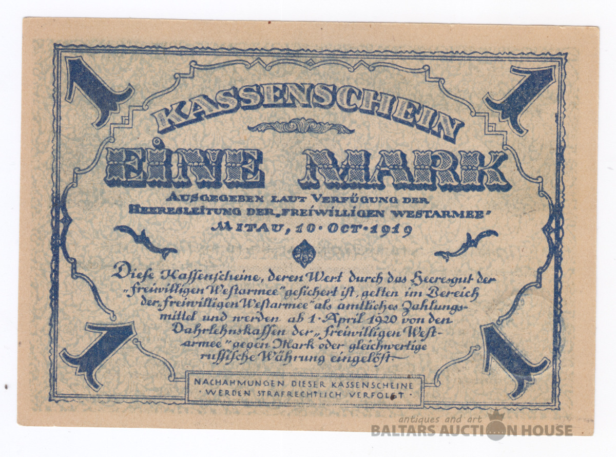 Banknote Latvija/Mītavā(Jelgavā) Rietumu brīvprātīgo armija, Bermondt, 1Marka 1919, UNC