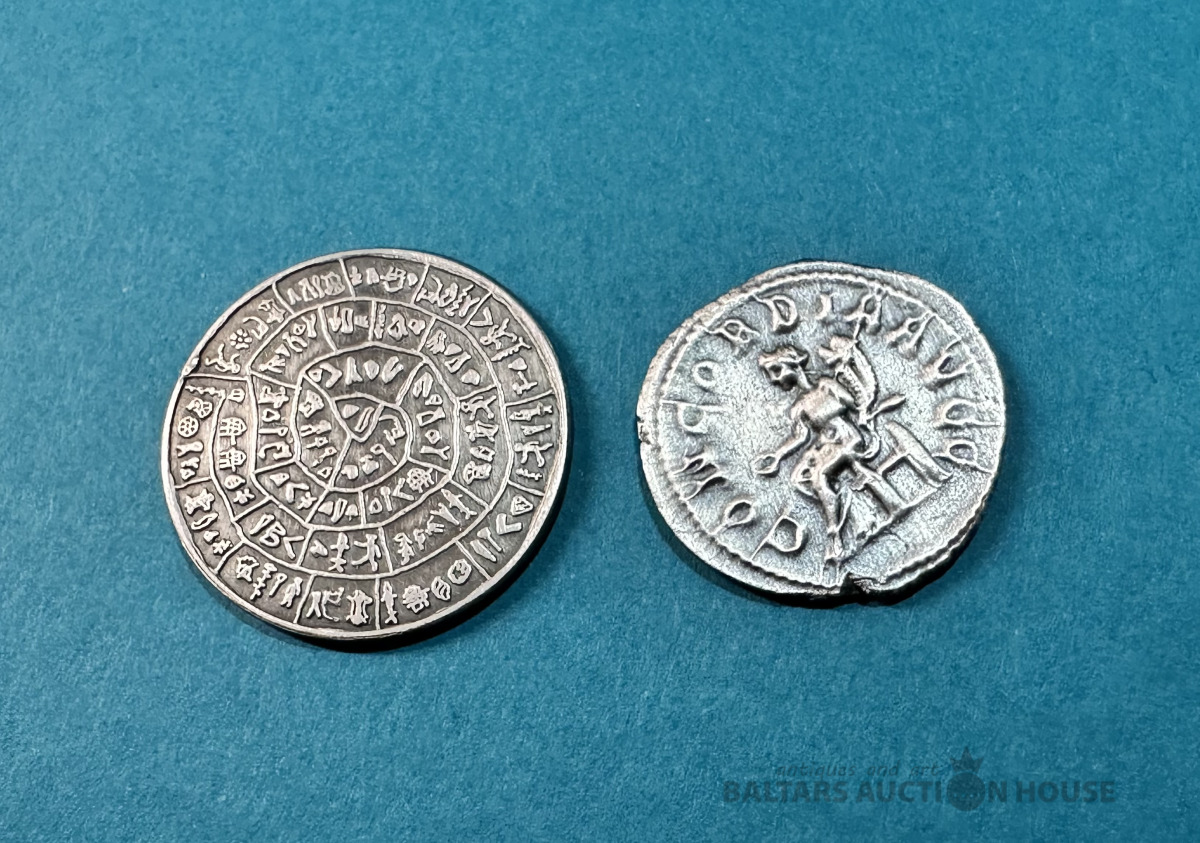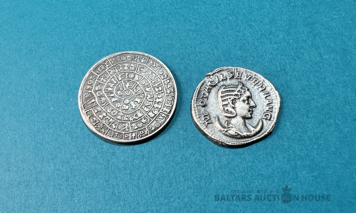 Divas sudraba monētas, replikas?, sudraba saturs ap 900 provi, Grieķija un Kanāda, svars 6.82 grami un 3.37 grami, diametrs 25.2 mm un 21.2 mm.
