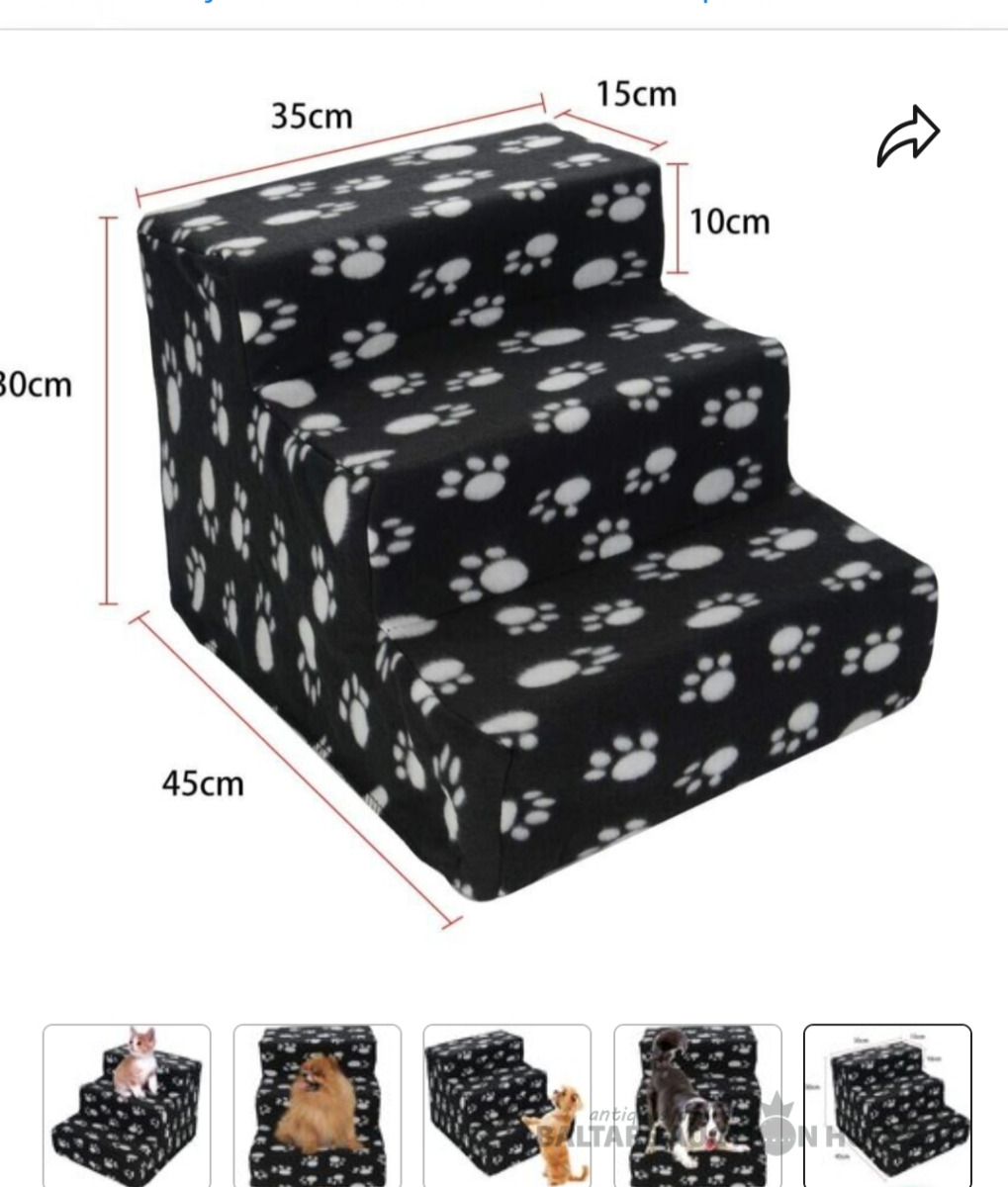 Jaunas Kāpnes maza auguma mājdzīvniekiem. izmērs: 45 x 35 x 30 cm. Mīkstais plīša audums. Piemērots mājdzīvniekiem gados : ar kāpnēm ir ērti mājdzīvniekiem uzkāpt pa dīvānu vai gultu bez locītavu un mugurkaula sāpem, vai nu mazājem lai nesavainoties lēkot.