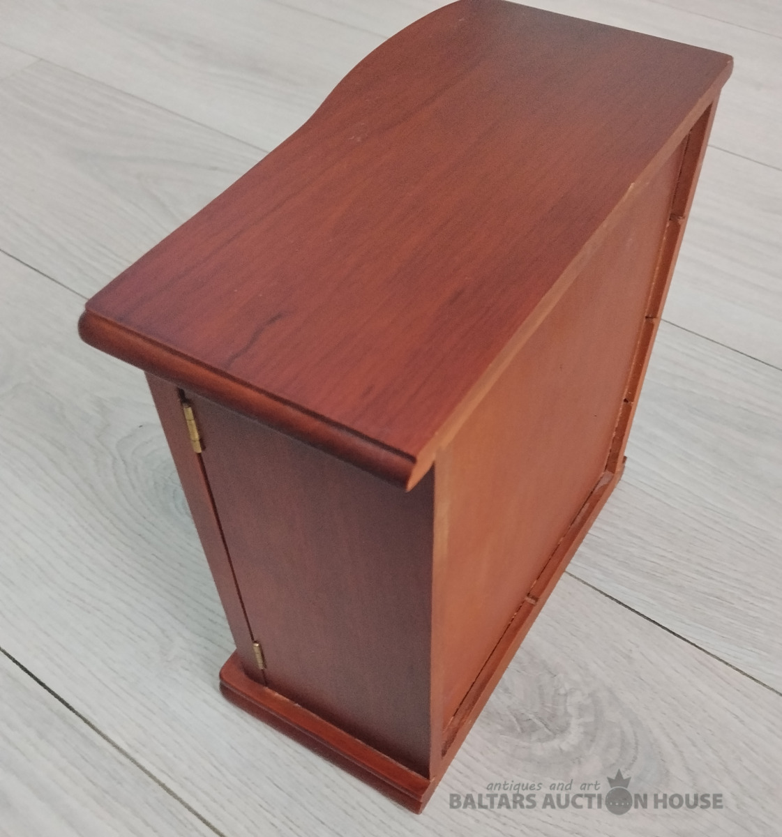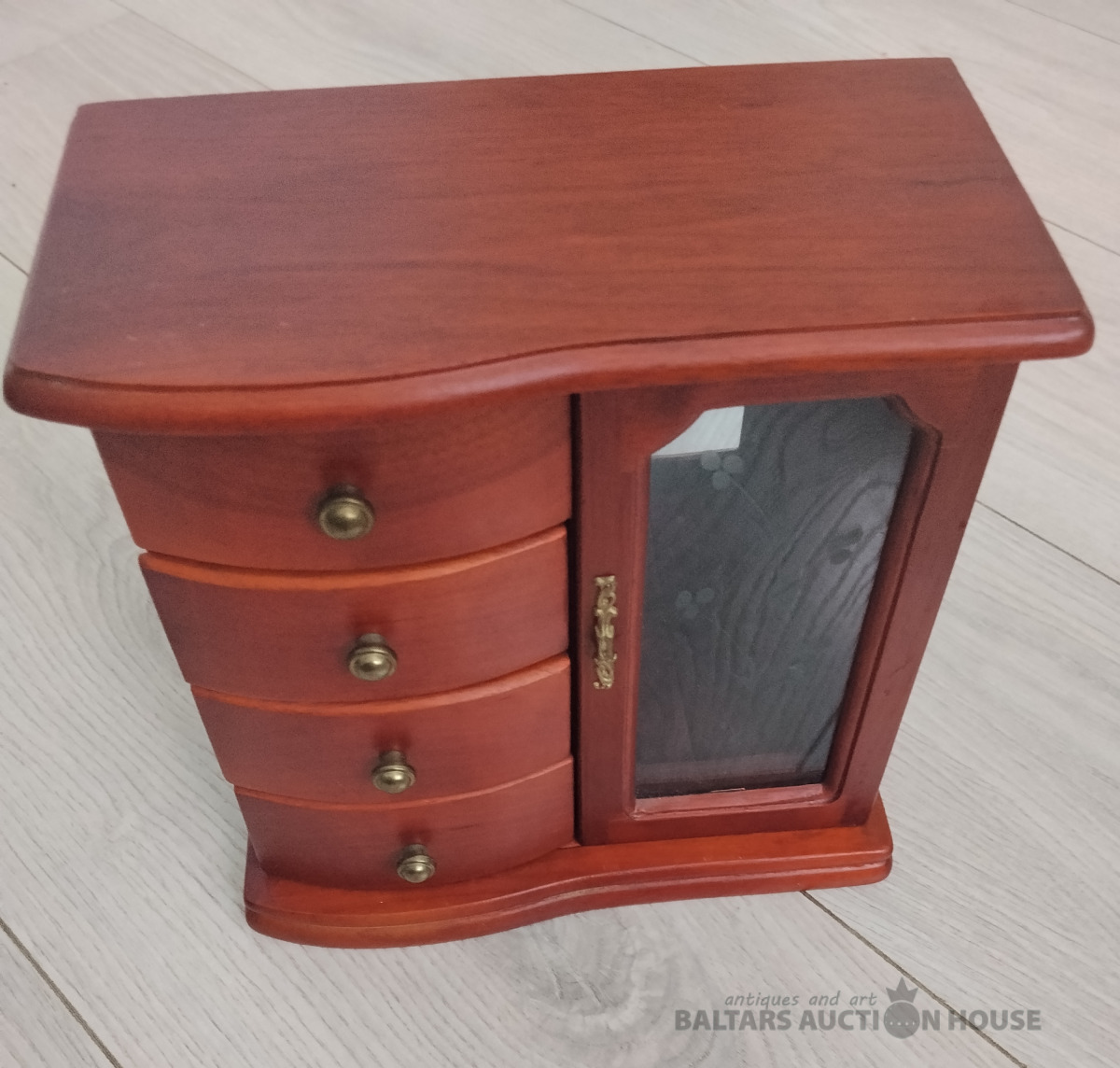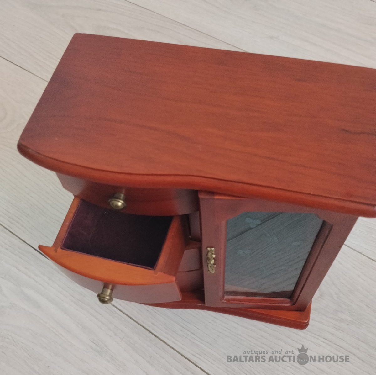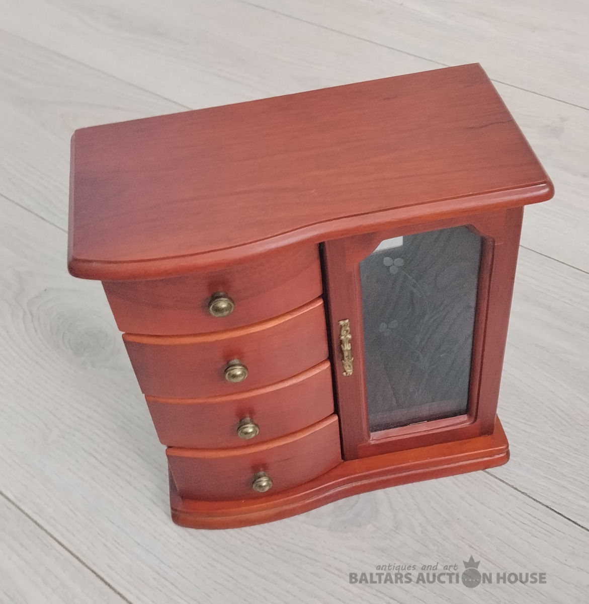 Koka rotu lāde skapja formā. Rokudarbs ar burgundijas krāsas samtu ieksā. Viss Jauns. H 22 cm * 21.5 cm *10cm. Ieksā spogulis, stikla durvis, atdalijums kēdem rotejosa lustras formā, léjā vieta gredzeniem. Cetras ietelpīgas atvilktnes piespraudēm, saktām, kuloniem un citām. Nr2410/5000.