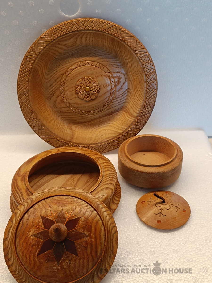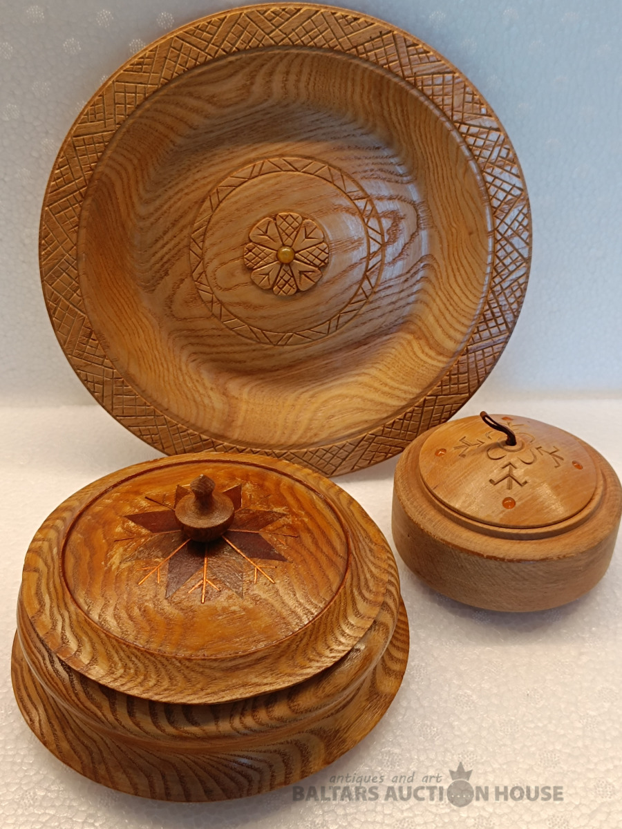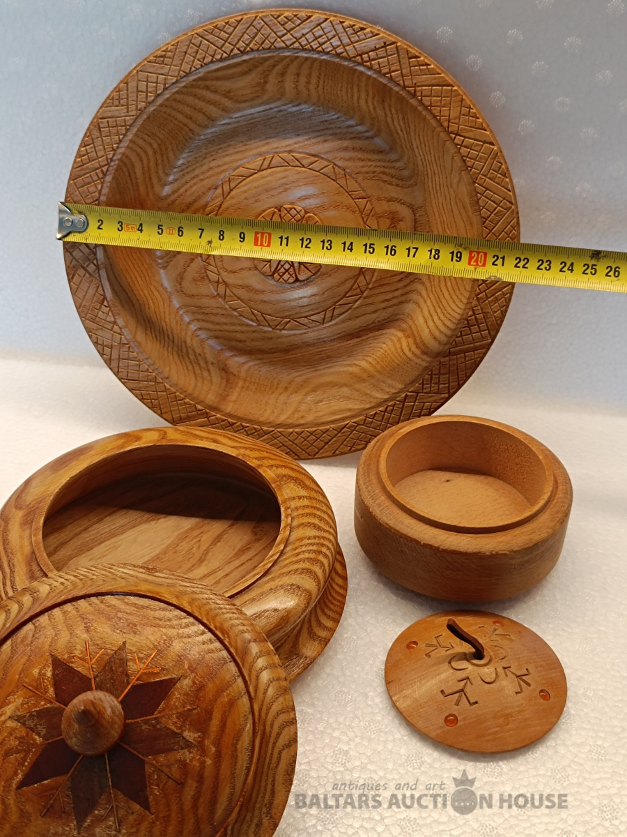 Daiļrade koks, lādītes un šķīvis ar dzintaru