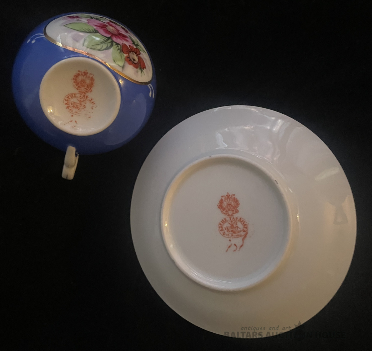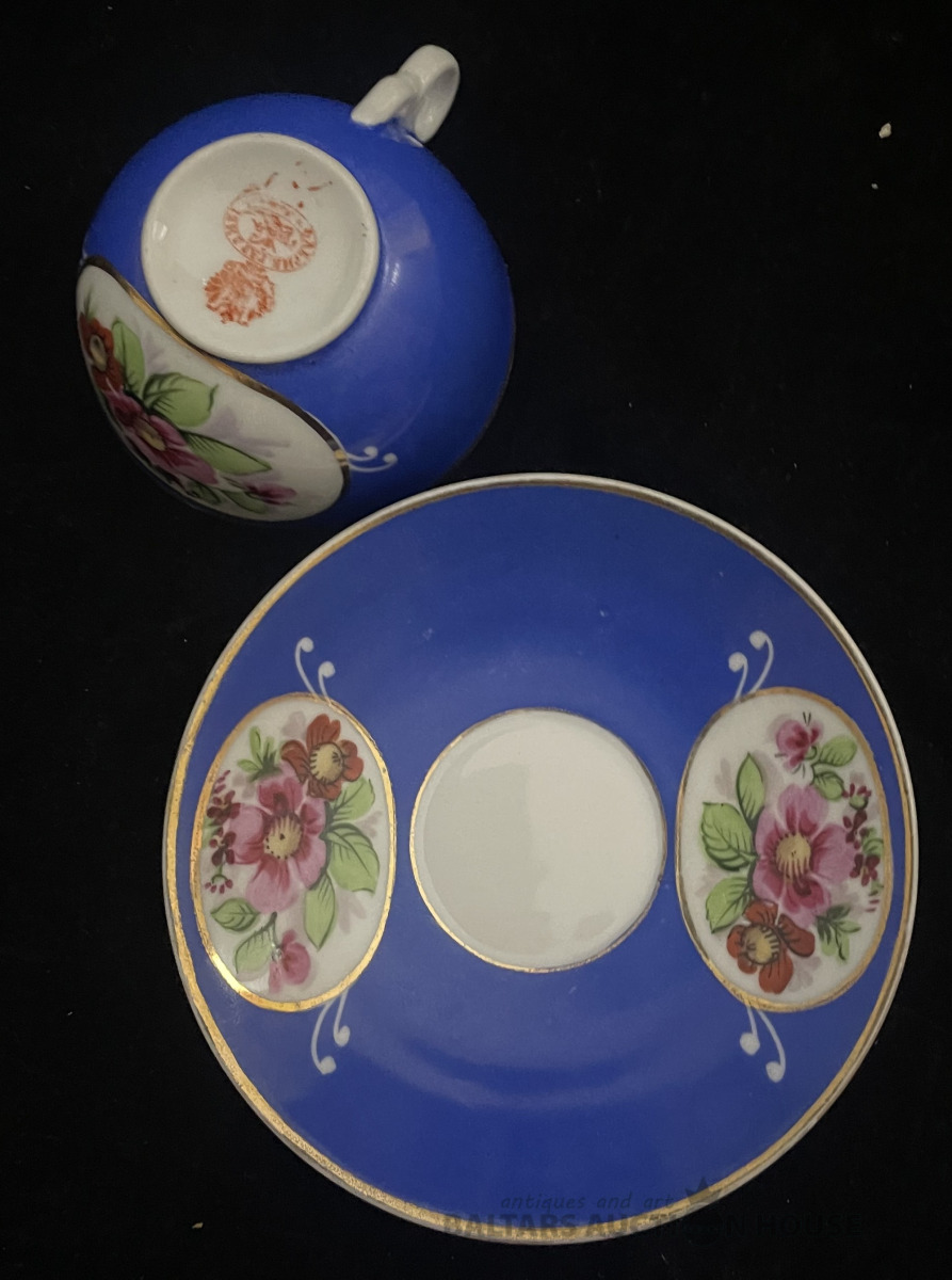 Skaists kafijas pāris, porcelāns, roku gleznojums, zeltījums, ap 1910.g., Gardner zīmogs tuvo austrumu tirgum !!! 1891.gadā Kuzņecovs nopērk Gardnera fabriku un turpina tajā ražot porcelāna izstrādājumus, nemainot fabrikas zīmogu. šīs tases h=4,7 cm, šķīvīša d=12,2 cm