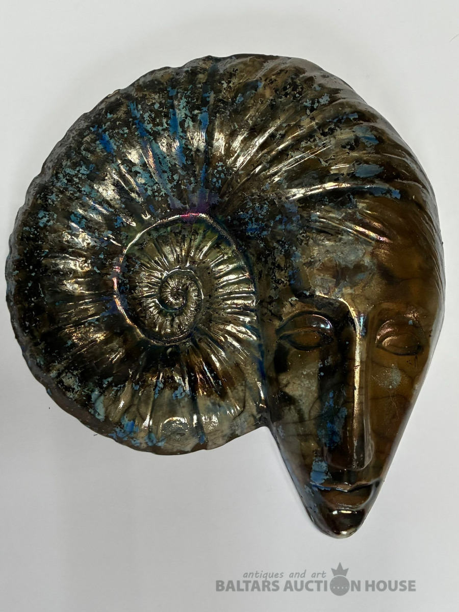 Elizabete Melbārzde. Amonīts. Pie sienas pakarama skulptūra akmensmasa roku apdedzināta. Izmērs 28x 25x5 cm.