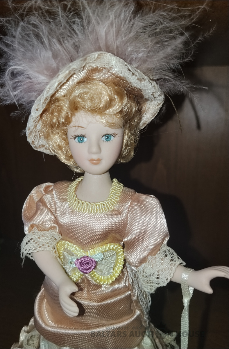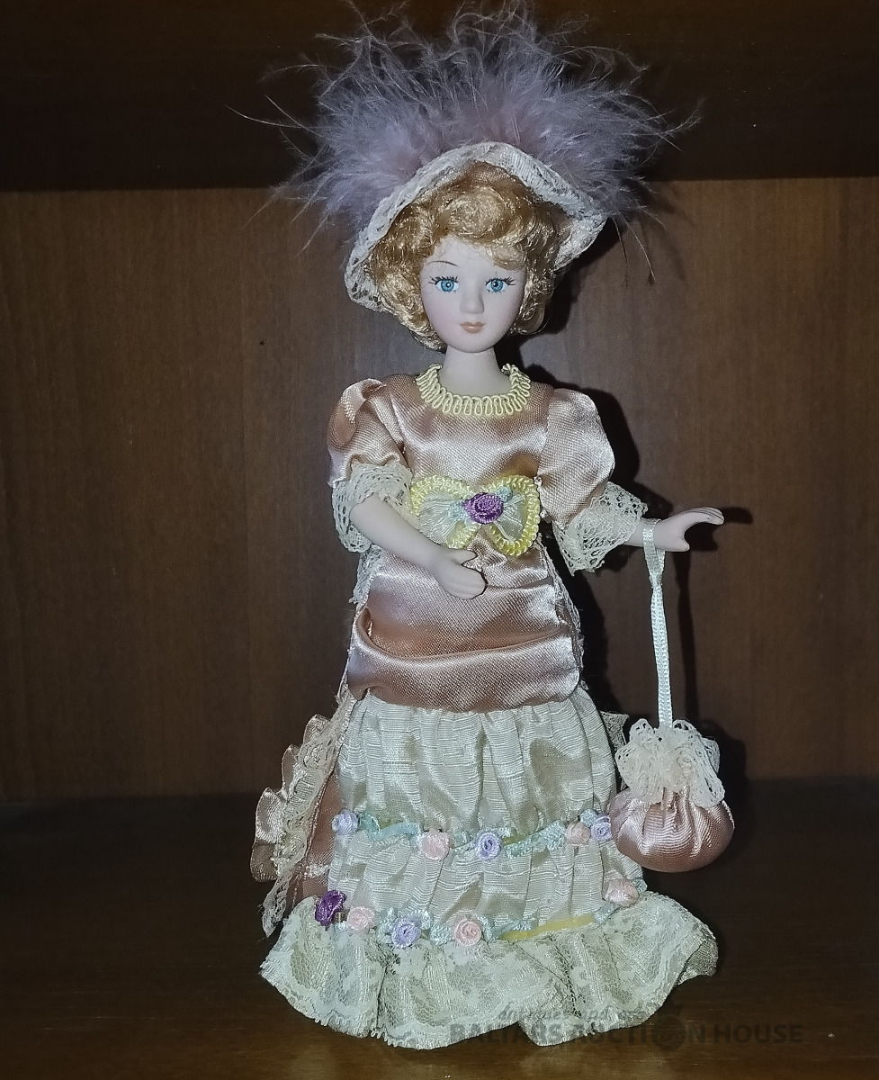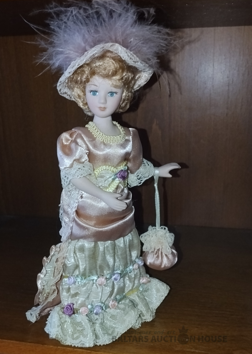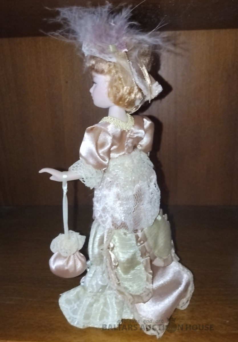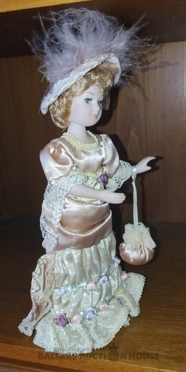 Porcelāna lellīte. H 20 cm. Kustīga galva, rokas, kājas. Mati, skropstas , kā arī originālais abgerbs un aksesuāri.