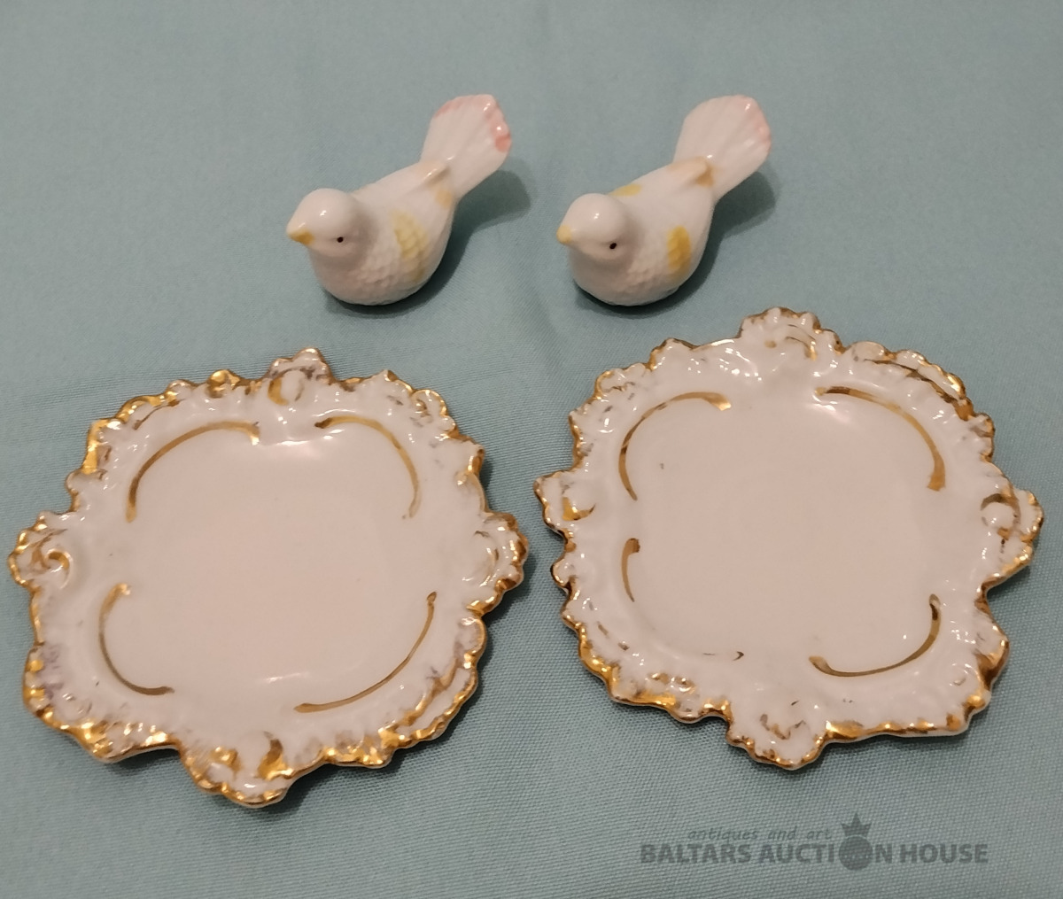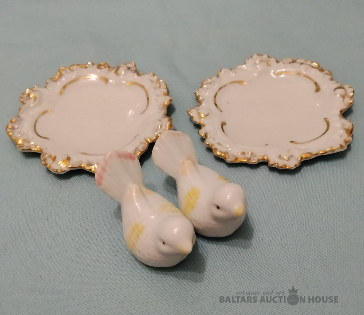 Divi porcelāna dekoratīvi skīvi (līdz 1940.g.) un Divi putniñi. Eiropa. Putns H 4 cm* 6 cm. Skīvis D 10cm.