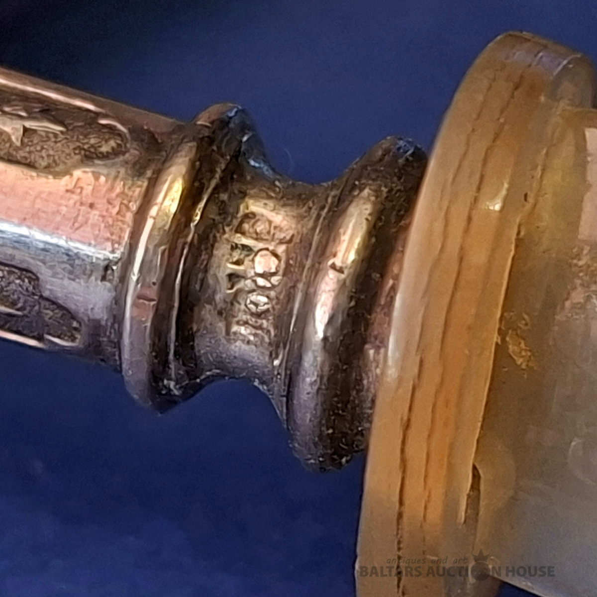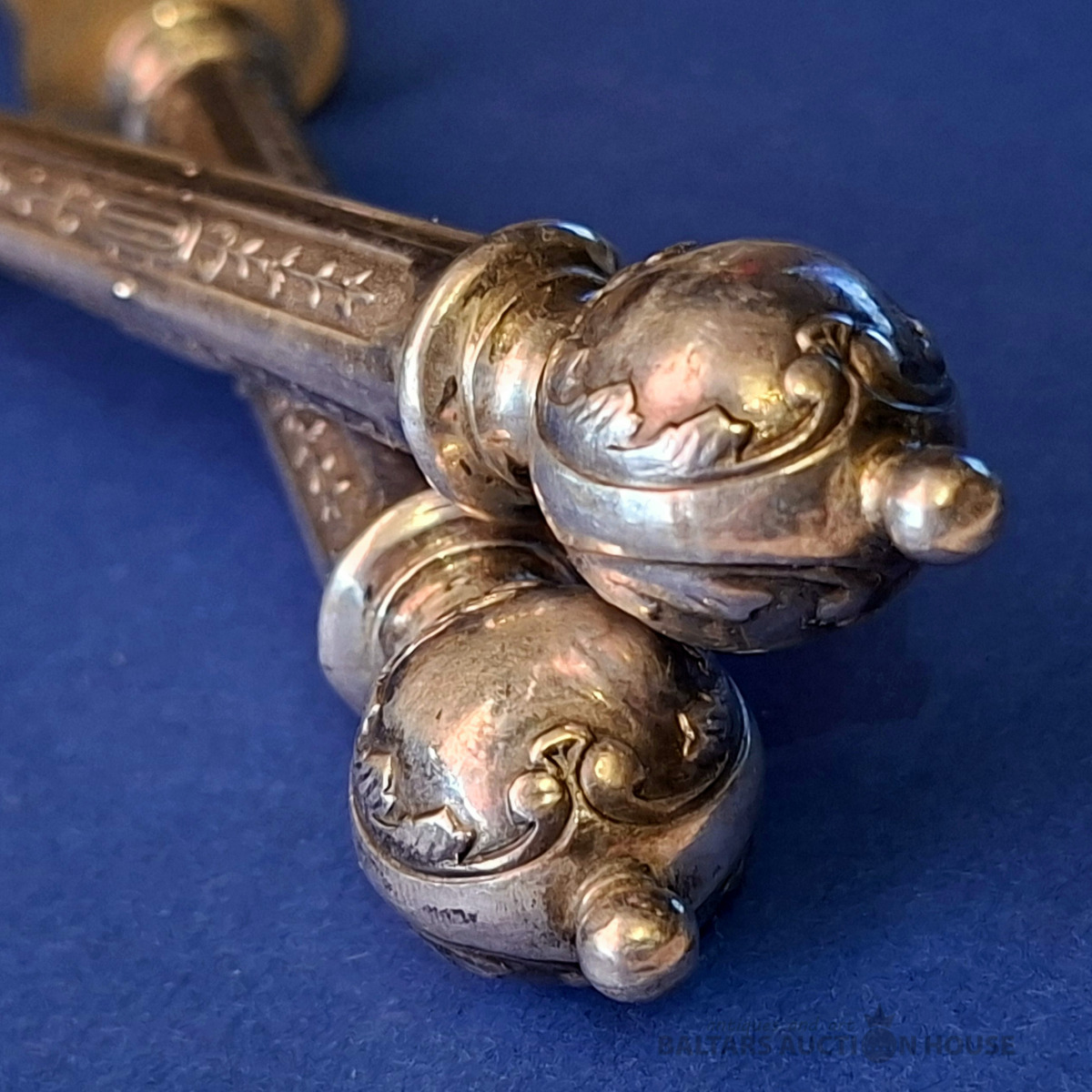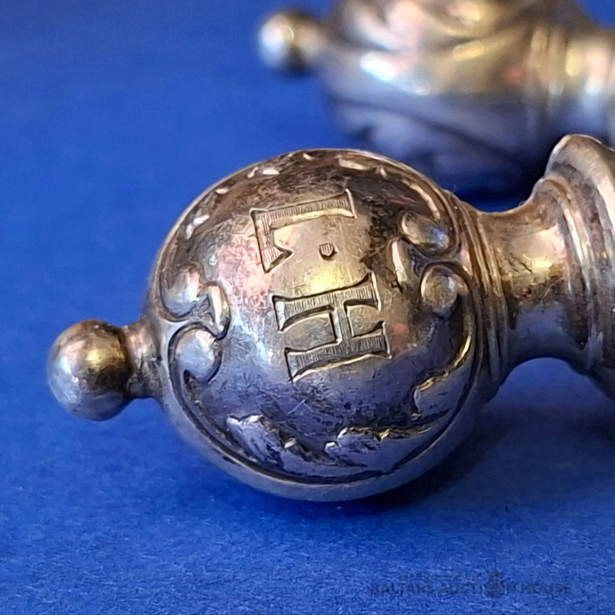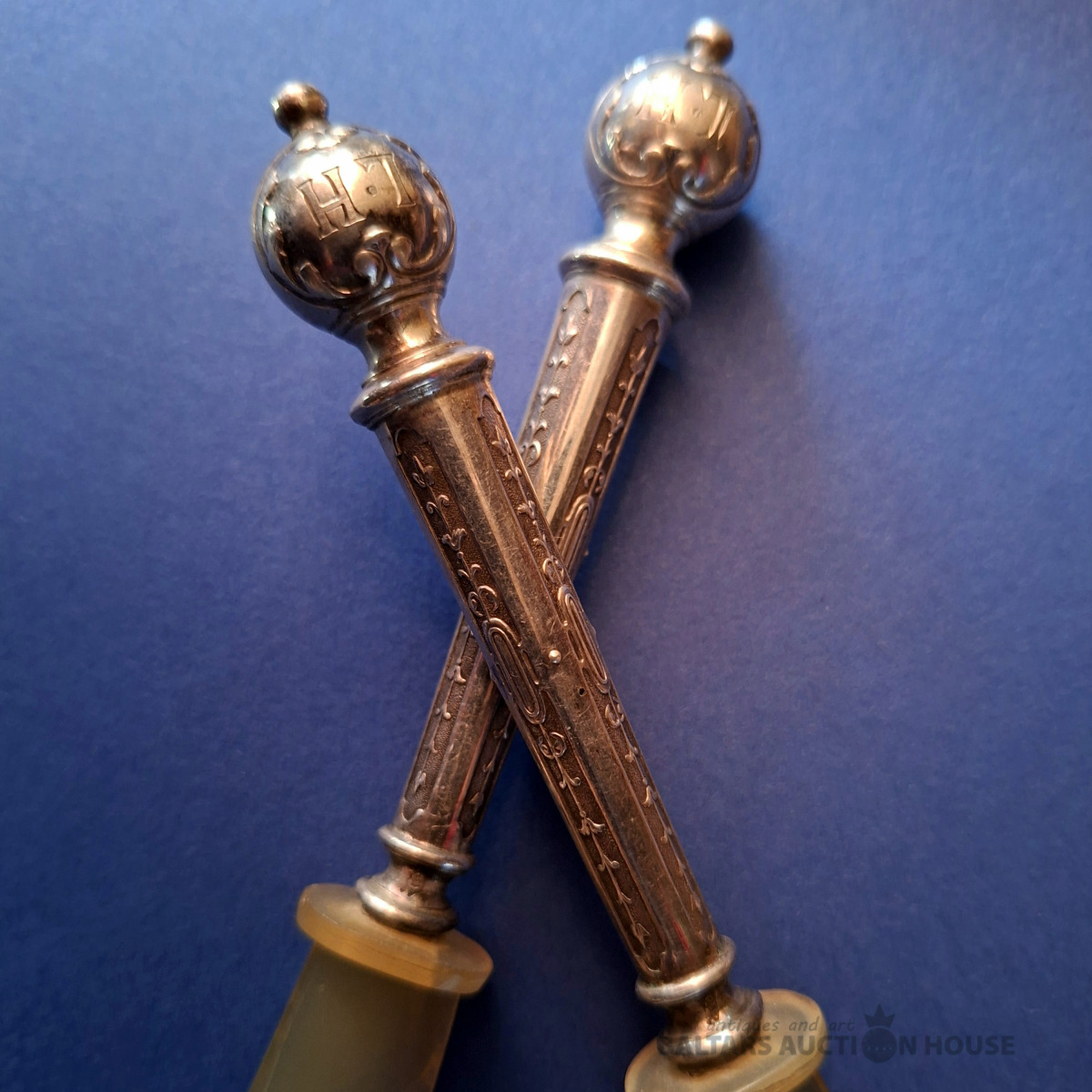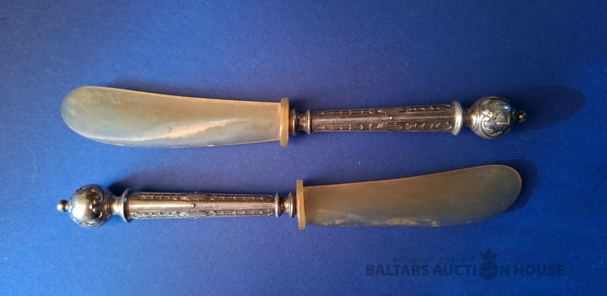 Divi antīki sudraba naži sviestam vai kaviāram ar sudraba rokturiem un asmeņiem, kas izgatavoti no dabīga, ragam līdzīga materiāla. Metālam ir dekoratīvs gravējums un sfēriska uzgaļa gala daļa. Lietojums: Pasniegšanas piederumi, bieži tiek izmantoti sviestam, sieram vai kaviāram, lai novērstu metāla oksidēšanos. Garums: 17,5 cm., Кopējais svars 54.25