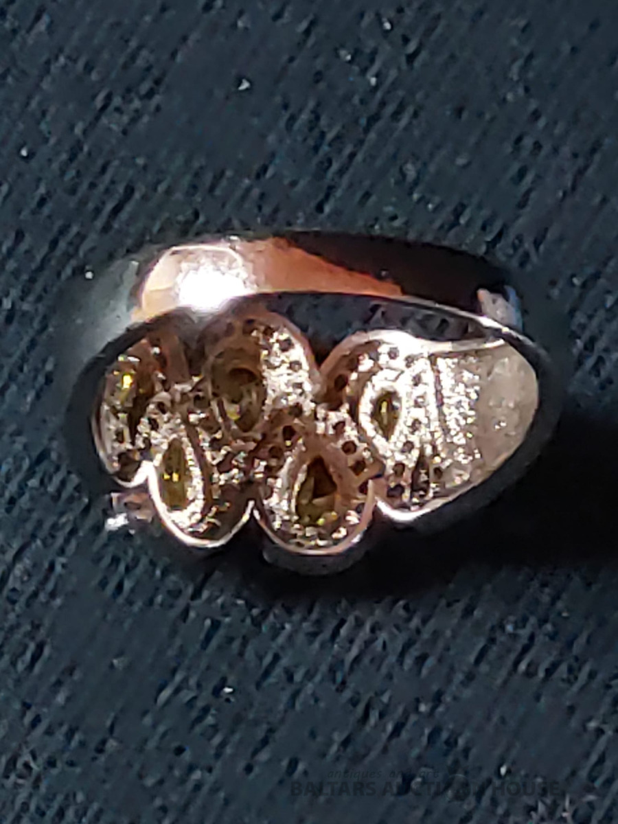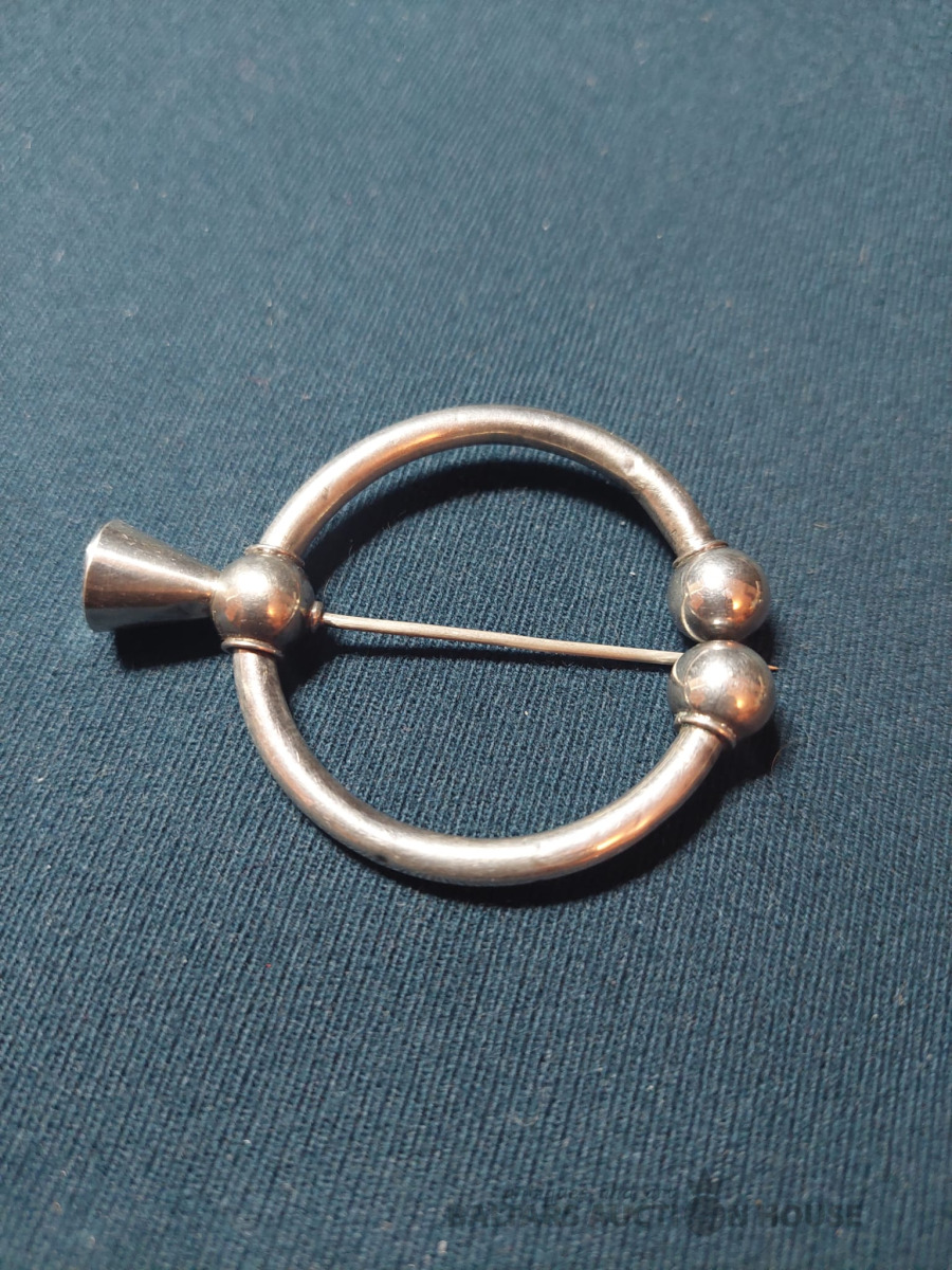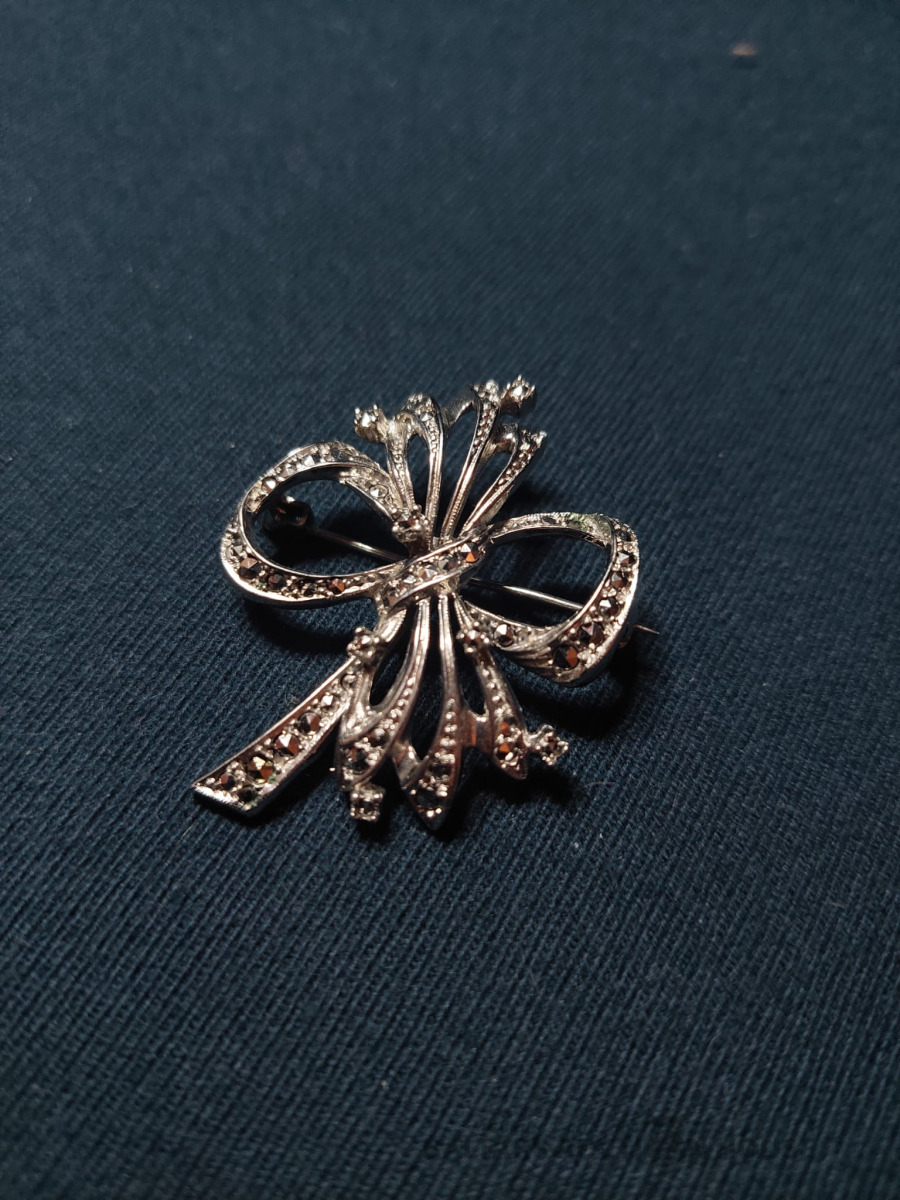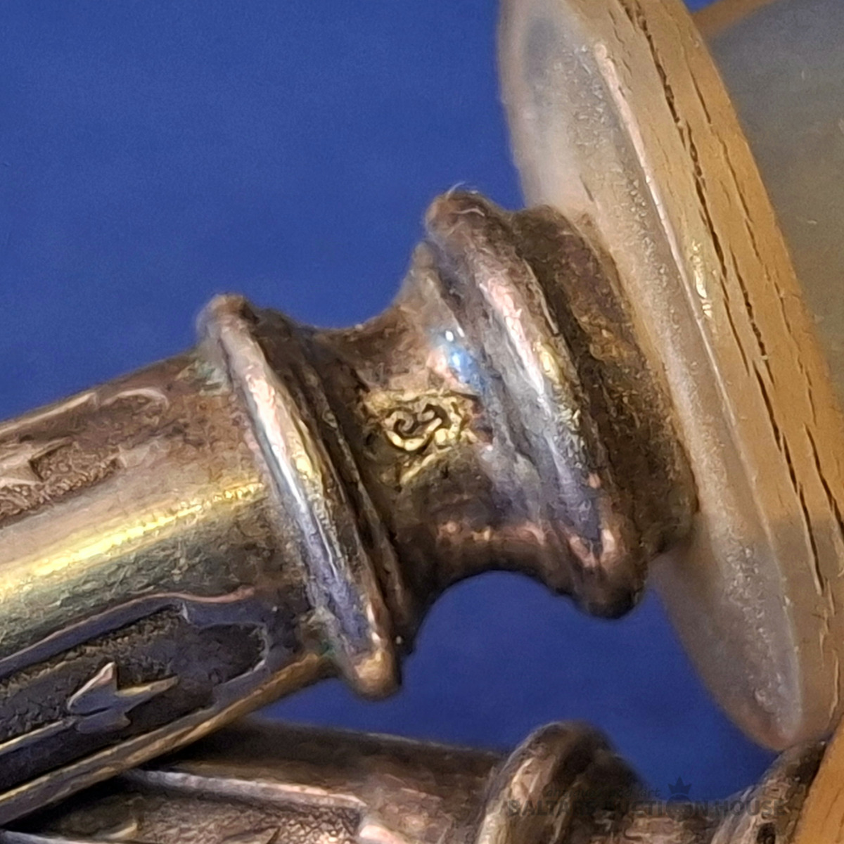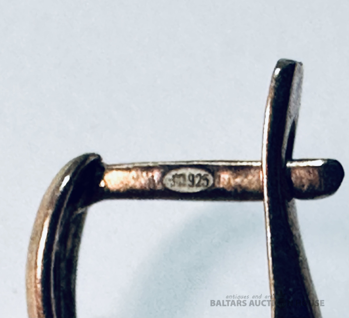 Divi antīki sudraba naži sviestam vai kaviāram ar sudraba rokturiem un asmeņiem, kas izgatavoti no dabīga, ragam līdzīga materiāla. Metālam ir dekoratīvs gravējums un sfēriska uzgaļa gala daļa. Lietojums: Pasniegšanas piederumi, bieži tiek izmantoti sviestam, sieram vai kaviāram, lai novērstu metāla oksidēšanos. Garums: 17,5 cm., Кopējais svars 54.25