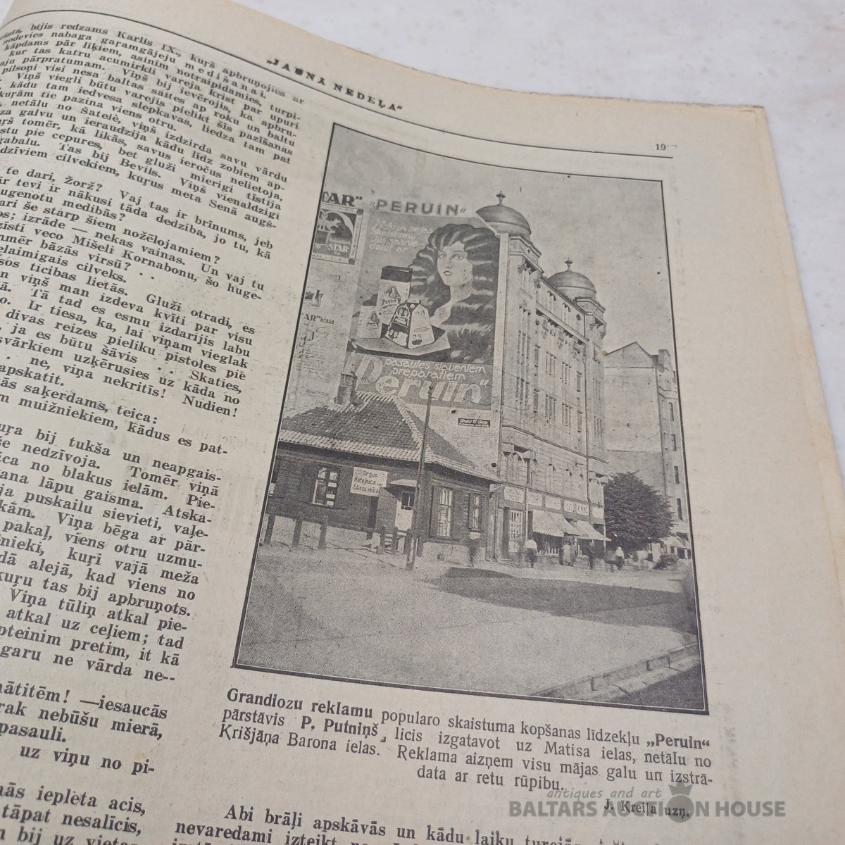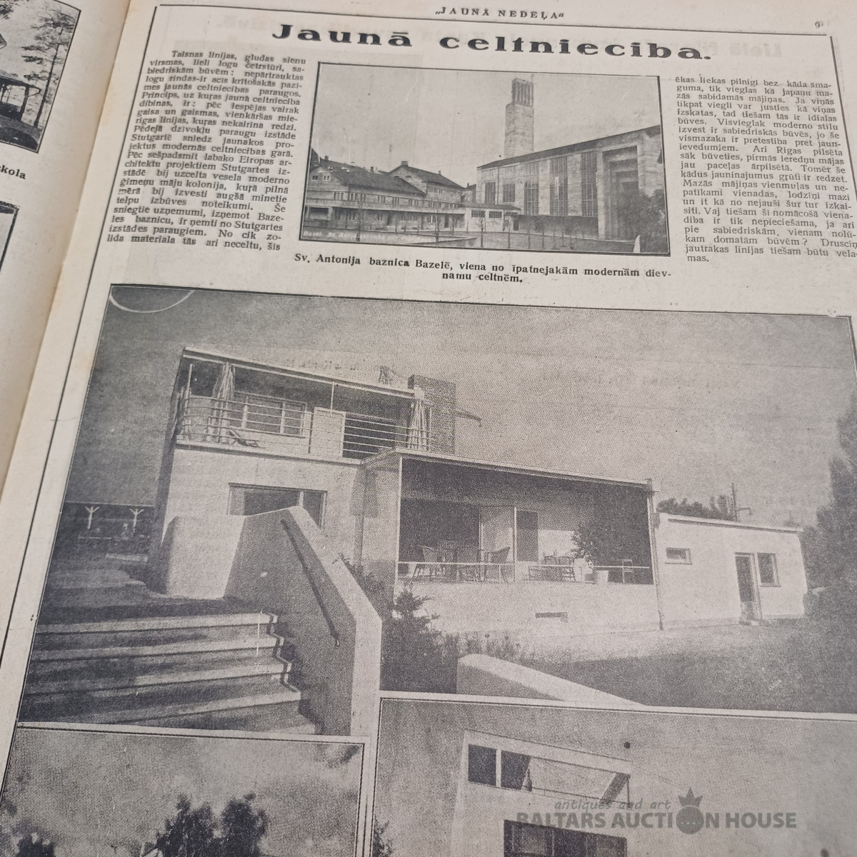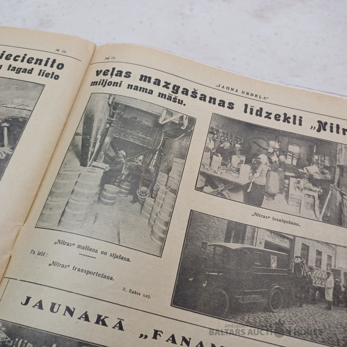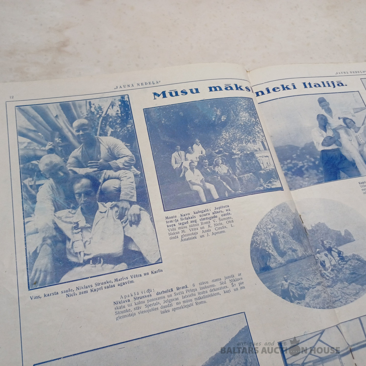 Jaunā NEDĒĻA 1927/19 –Vaku zīm. Strunke. Rūpniecība Latvijā. Daudz Latvijas sadzīves foto. Mūsu mākslinieki Itālijā foto. Oto Skulmes erotiska rakstura ilustrācija uz aizmug. vāka. Ieskatu skatīt bildēs