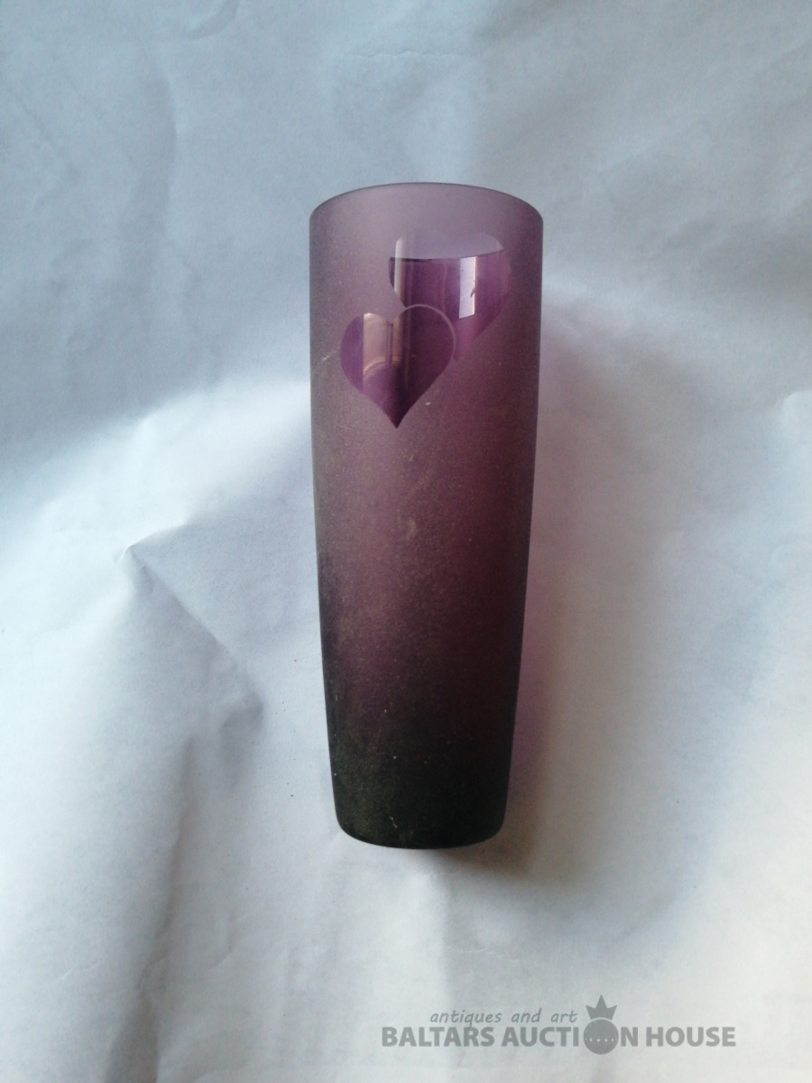 Vāze ar divu siržu attēlu, krāsains stikls, augstums 16,5 cm, diametrs augšā 6,5 cm. Nelietota.