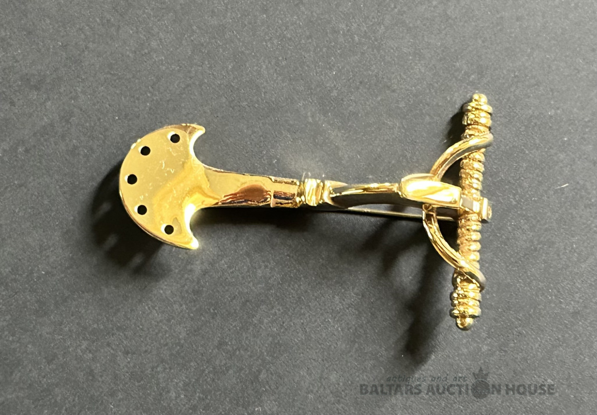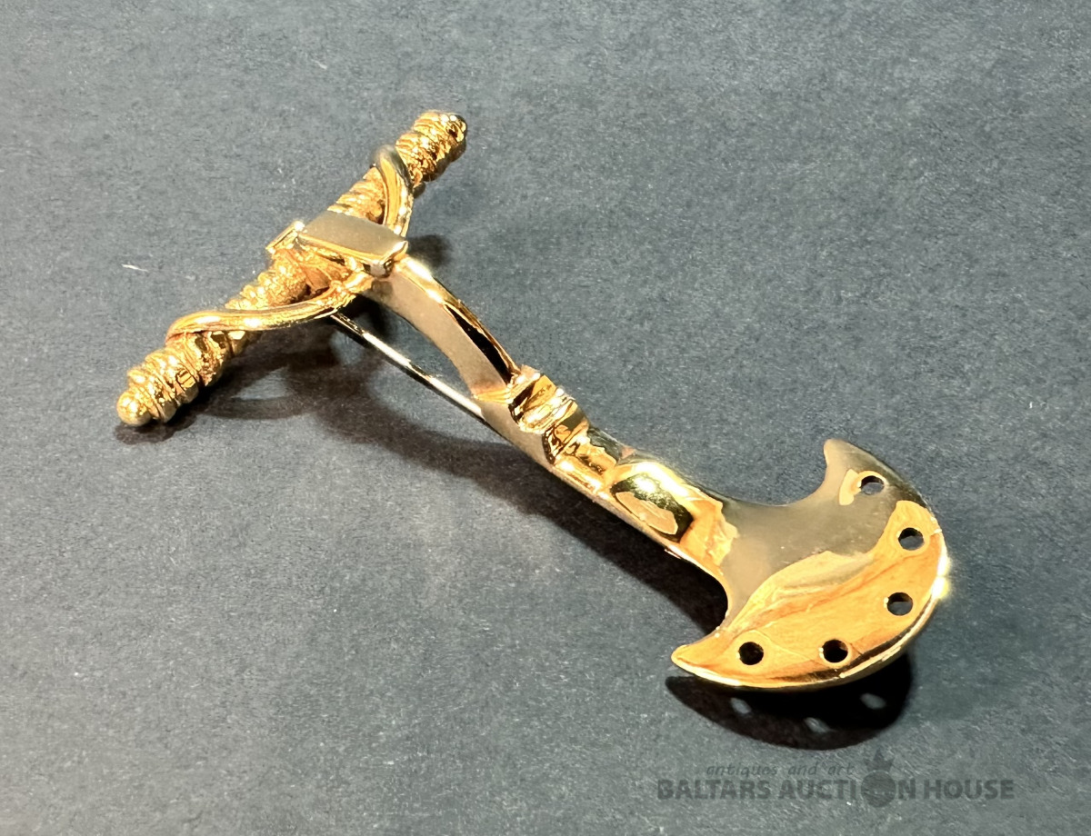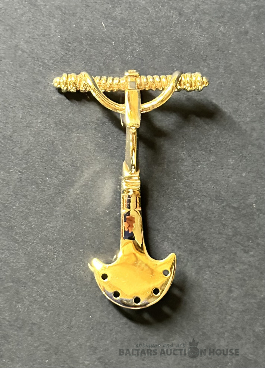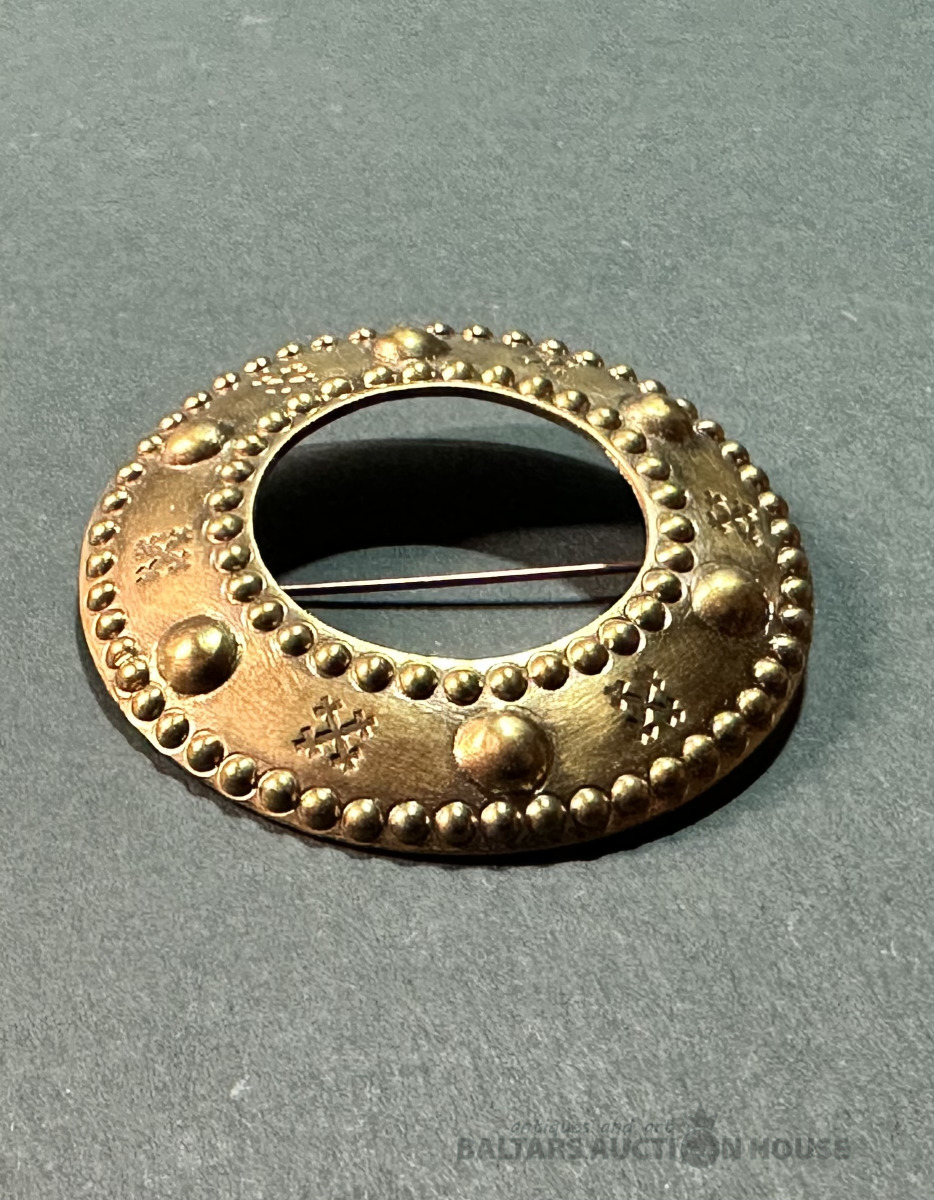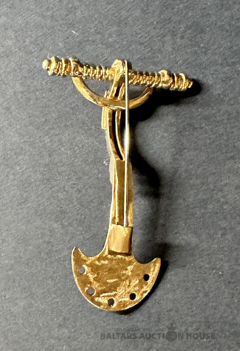 Stopsakta, amatnieka darbs, sarkandzeltena bronza ar vara saturu ap 85%, izgatavota 20/21. mija, glabāta privātkolekcijā, nav valkāta, lielums 6x4 cm.