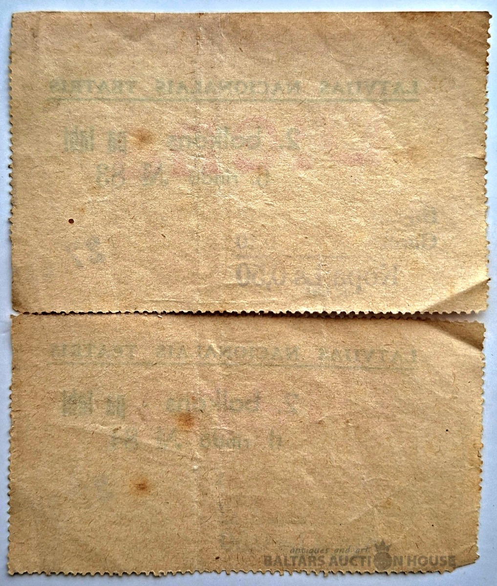 Biļetes uz Latvijas Nacionālo teātri. Vieta: 2. balkons, labajā pusē, 6. rindā. Datums: 27. decembris. Cena: 0,50 LVL (ieskaitot garderobi).