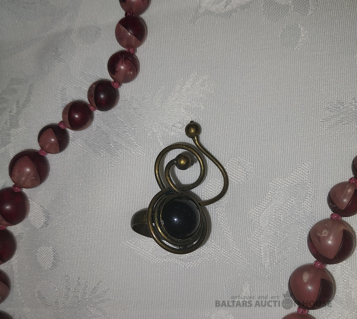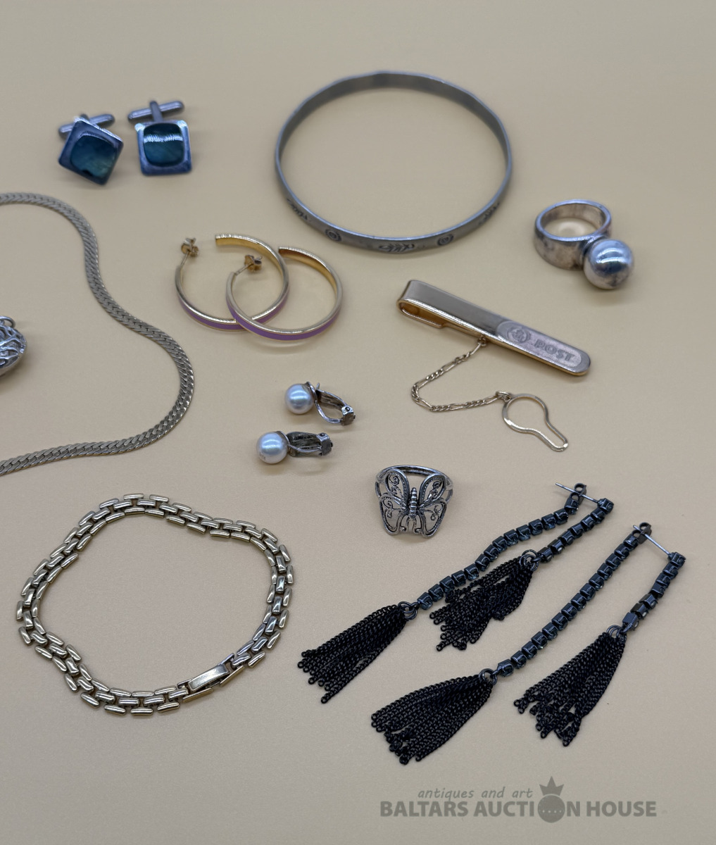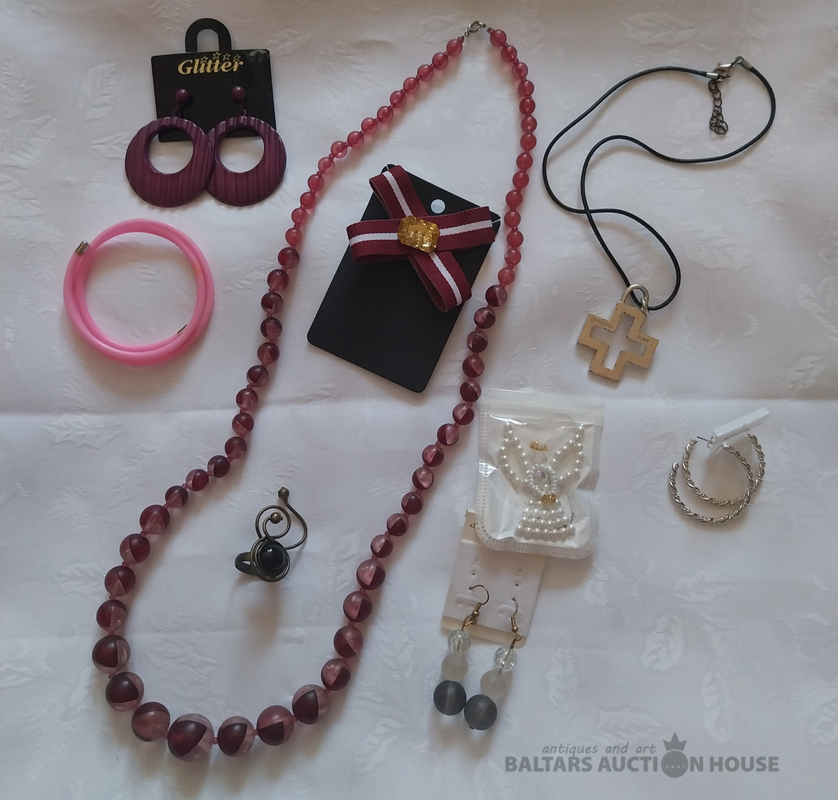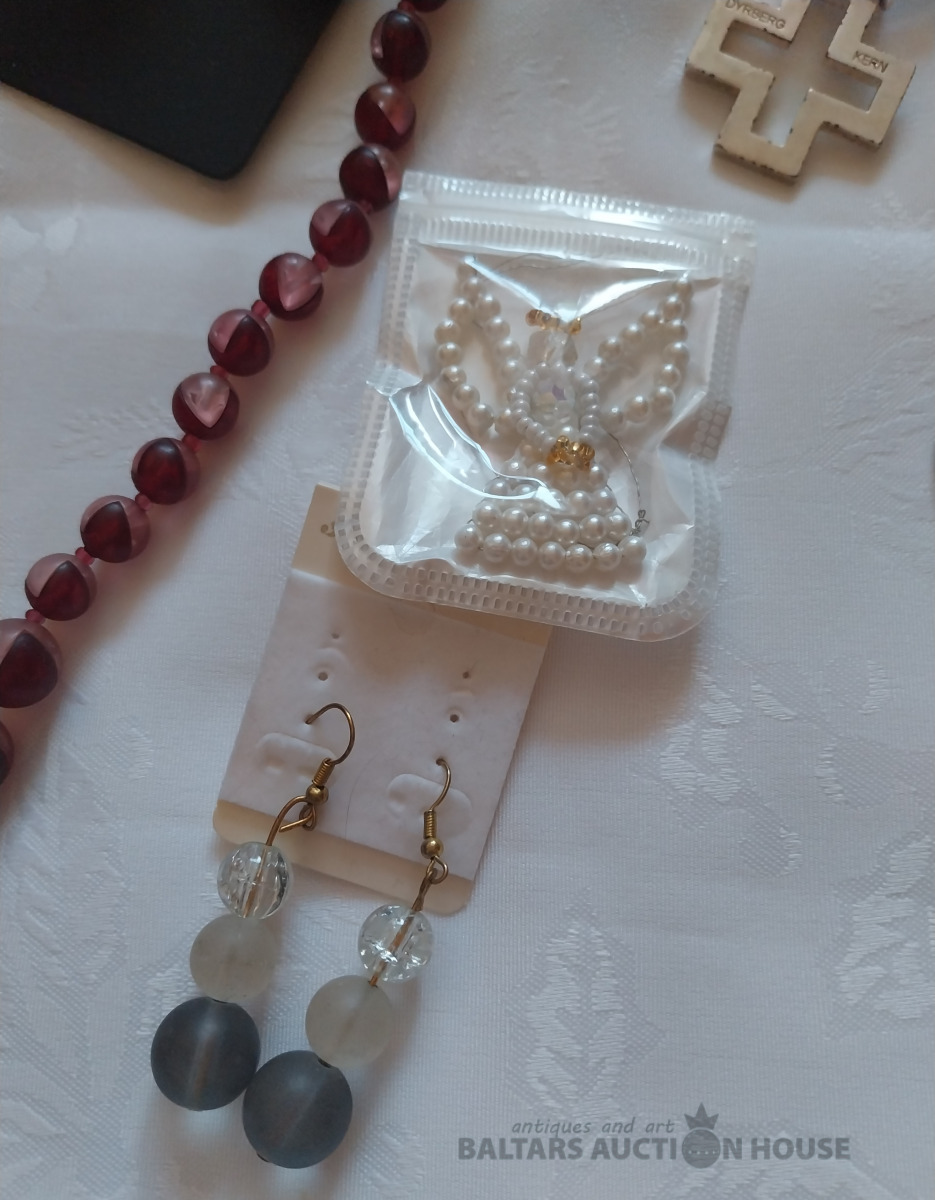 Dažāda bižutērija: senlaicīgas krelles, jauna patriotiska piespraude, 3 pāri auskaru. Kaklarota- dāņu dizains Dirberg Kern, Sargeņģelis suvenīrs iepakojumā. Abstrakcijas Gredzens ~ Izm.17. Aproce. Kopā 9 gab.