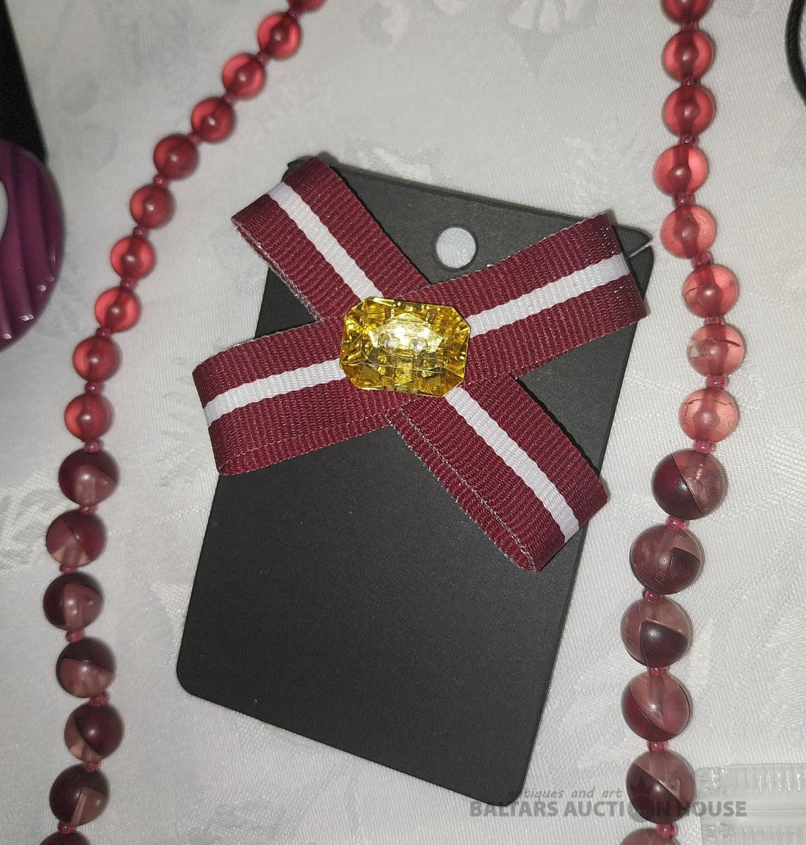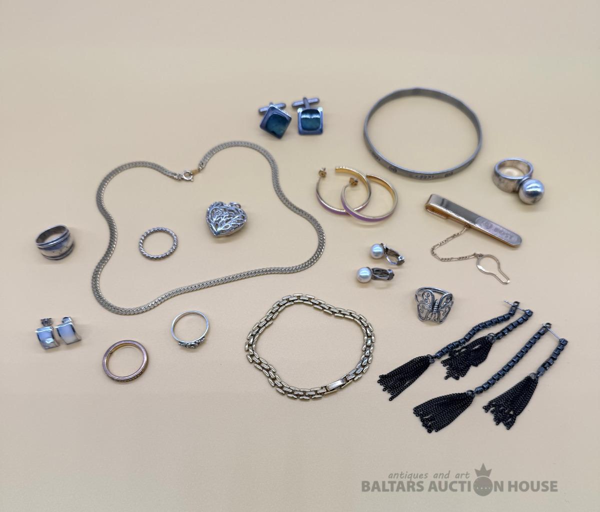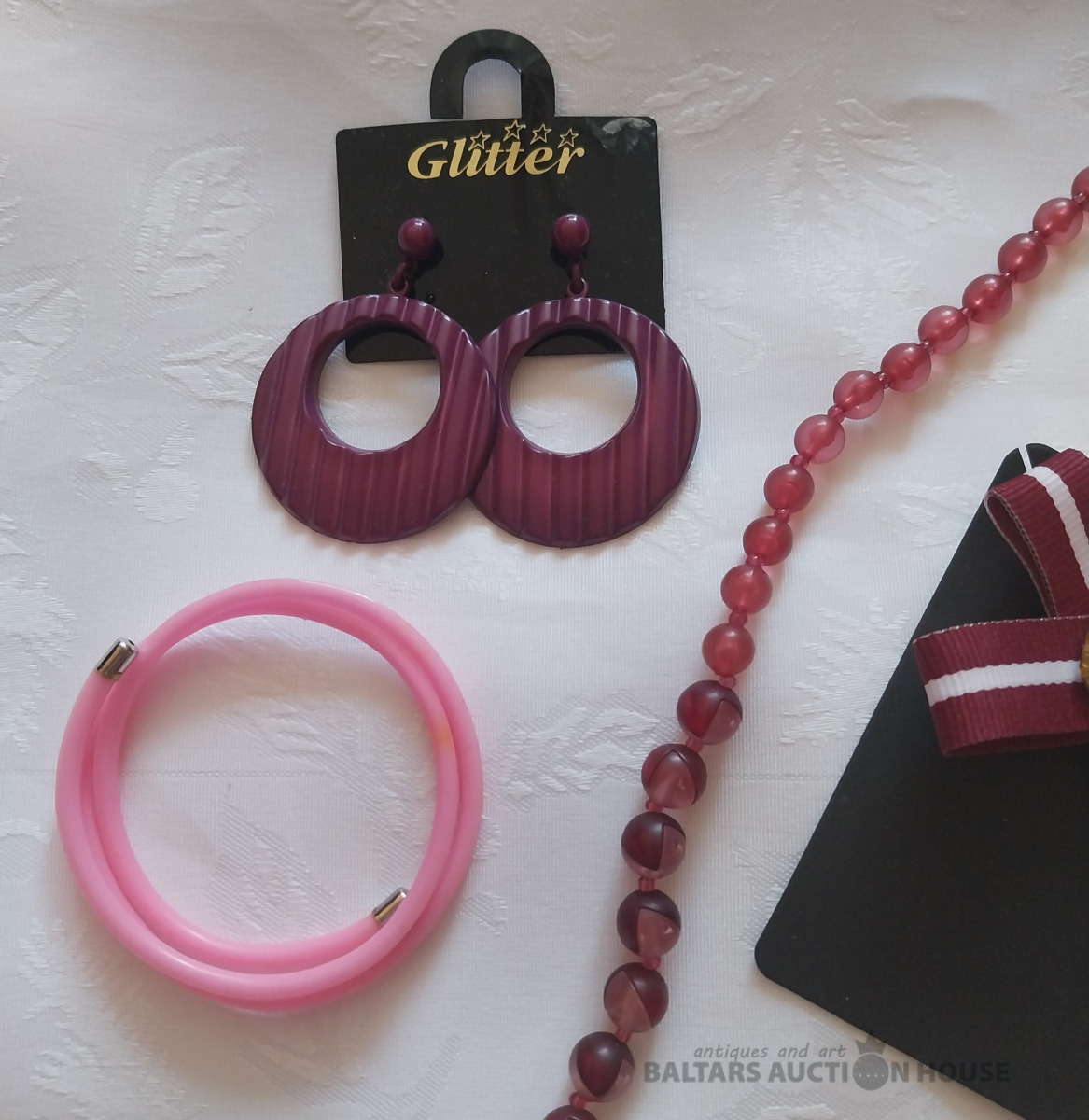 Dažāda bižutērija: senlaicīgas krelles, jauna patriotiska piespraude, 3 pāri auskaru. Kaklarota- dāņu dizains Dirberg Kern, Sargeņģelis suvenīrs iepakojumā. Abstrakcijas Gredzens ~ Izm.17. Aproce. Kopā 9 gab.